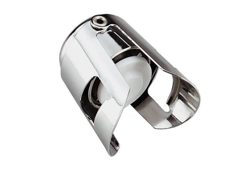 Bouchon pratique pour bouteilles de champagne et vins effervescents, le bouchon est chromé et s'ouvre simplement, puis se pose sur le col de la bouteille et se rabat à nouveau, le tout sous l'influence d'une légère pression
