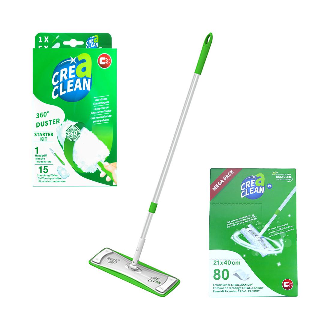 Für Trocken- oder Feuchtreinigung, Ideal für die Boden- und Staubreinigung, Umfangreiches Set, , Produktinformation, Reinigungssystem für Trocken- oder Feuchtreinigung, Mit leistungsstarkem Staubwischer für tägliche Reinigung, Auf allen gängigen Staubfanggeräten einsetzbar, Trockene Ersatztücher für das Reinigungssystem , Elektrisch aufgeladene Mikrofasern für maximale Haftung, Auch zur Reinigung von Hand, ohne Gerät geeignet , , Inhalt:, 1 x CREaCLEAN Bodenreinigungssystem XL, 80 x CREaCLEAN trockene Ersatztücher XL, 1 x CREaCLEAN Dusty Handgriff, 15 x CREaCLEAN Dusty Staubfang- Tücher 360°