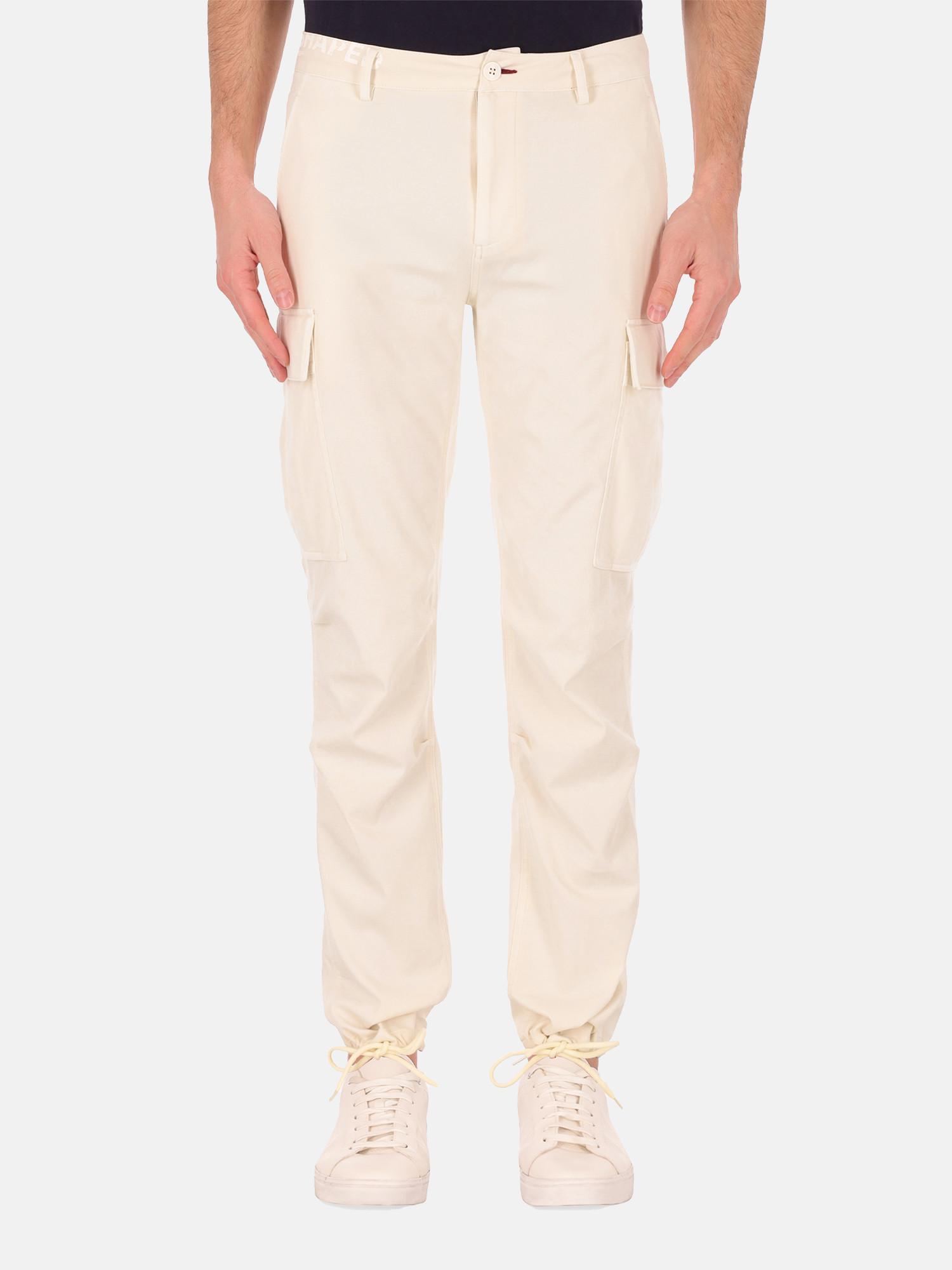 Ce pantalon cargo à coupe classique est confectionné en tissu point de Milan teint avec un effet vieilli. Le design comprend des poches françaises sur le devant, des poches à rabat à l'arrière et des poches cargo sur les hanches, ainsi qu'un cordon de serrage au bas.