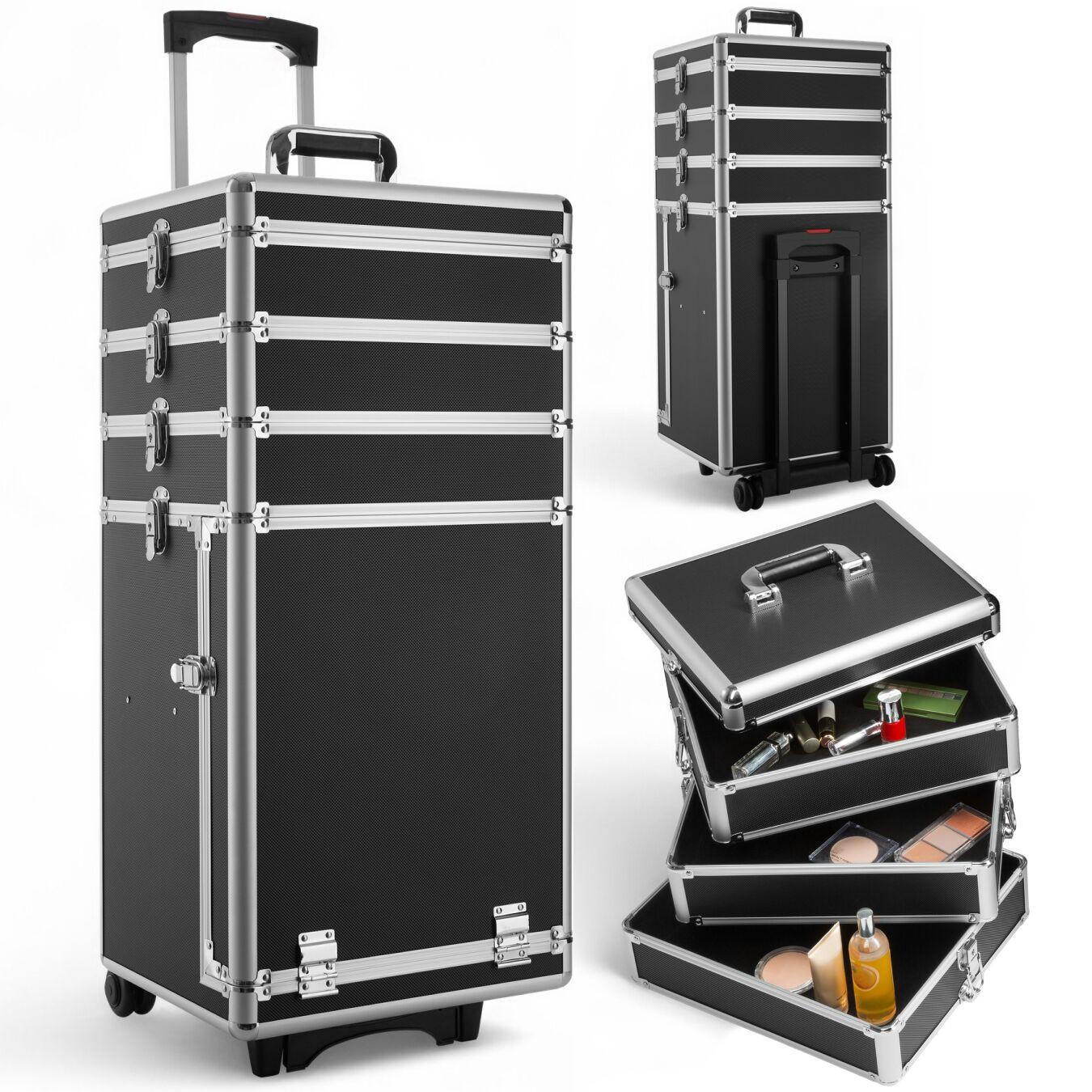Valise Trolley esthétique, Malette cosmétique, coiffure, manucure, maquillage Vanity Rigide avec roulette TECTAKE. Notre valise universelle a été extrêmement soignée. Conçue à partir de 4 coffrets dont un grand avec compartiment frontal et 2 niveaux laissant beaucoup de place à vos différents accessoires. Grâce aux différents compartiments, vos effets sont séparés et organisés. Tous les compartiments ferment à clé. Les surfaces intérieures sont habillées de velours noir. Grâce aux doubles roulettes caoutchoutées et au pied rétractable, la valise est idéale pour le transport de charge plus lourde. Une poignée télescopique extractible garantie un maintien optimal lors des déplacements sur roulettes. Notre valise trouve une utilité optimale pour répondre aux besoins de différents loisirs etc. : Valise cosmétique. Valise pour visagiste. Valise pour manucure. Valise pour coiffeur. Valise à outils. Valise pour pilote. Valise pour pêcheur. Valise pour couturier. Valise pour les foires. etc.
