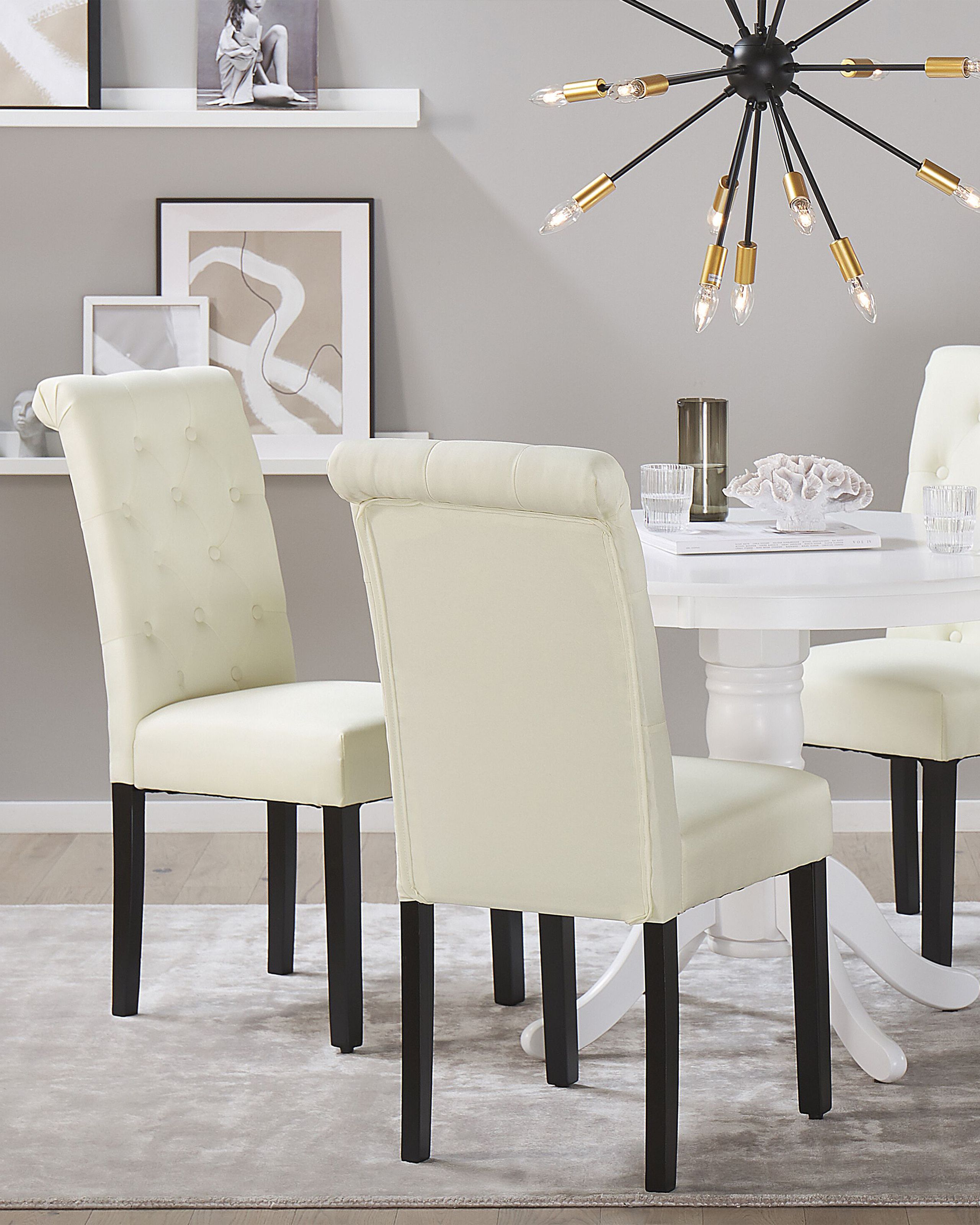 Deux élégantes chaises tapissées avec capitonnage. Salon, chambre ou salle à manger ? La couleur classique et classieuse crème du revêtement en polyester et l'élégante finition Chesterfield capitonnée en diamant font de ces chaises de véritables bijoux avec une touche de glamour. Vous pouvez créer un look luxueux et royal dans chaque pièce et leur trouver une place spéciale à la table à manger ou à la coiffeuse. Profitez de l'assise et du dossier légèrement rembourrés, de la finition de haute qualité, du haut niveau de confort d'assise et du design superbe de ce lot de deux chaises en tissu.