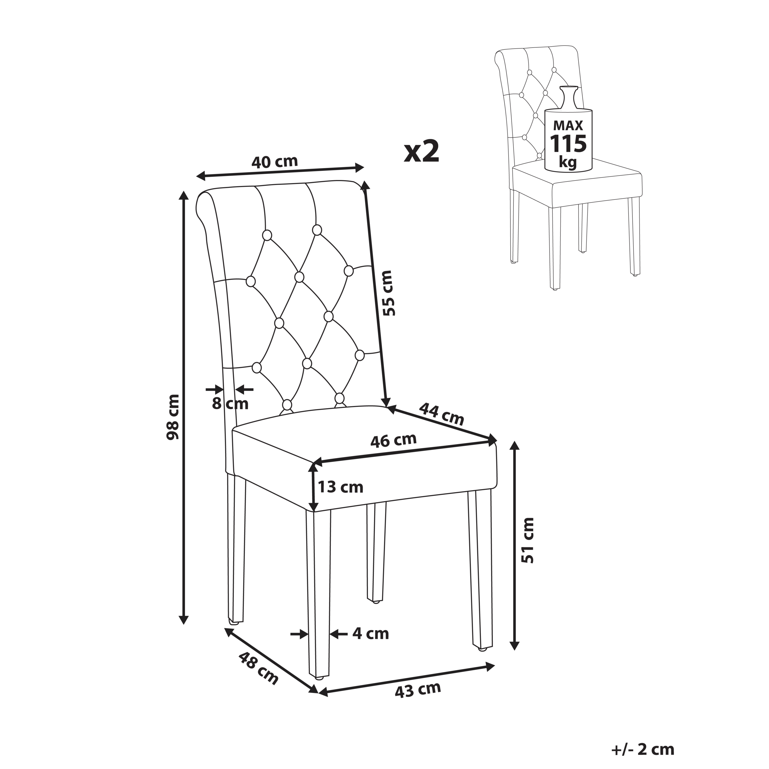 Loffre inclue:</b> 2 x Chaise<br> <br><b>Caractéristiques clés:</b> Modèle à haut dossier et assise épaisse, Pieds stables, solides et élégants, Style classique, Capitonnage décoratif, Entièrement rembourré sur tous les côtés, Patins pour le pieds assurent la protection contre les rayures<br> <br><b>Informations dassemblage: À assembler entièrement. 20 - 40 min