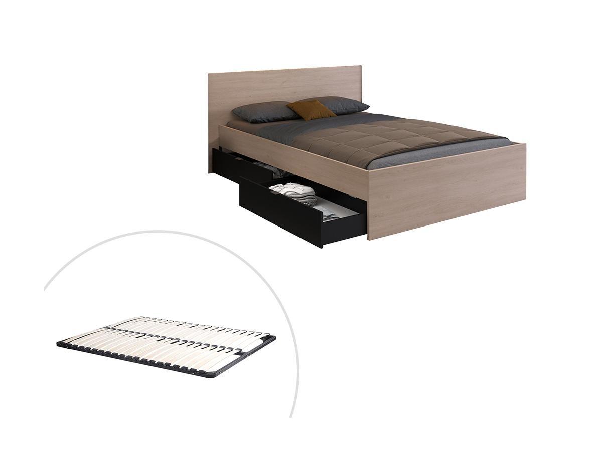 Vente-unique, Lit avec 2 tiroirs 140 x 190 cm - Coloris : Naturel et noir + sommier - VELONA