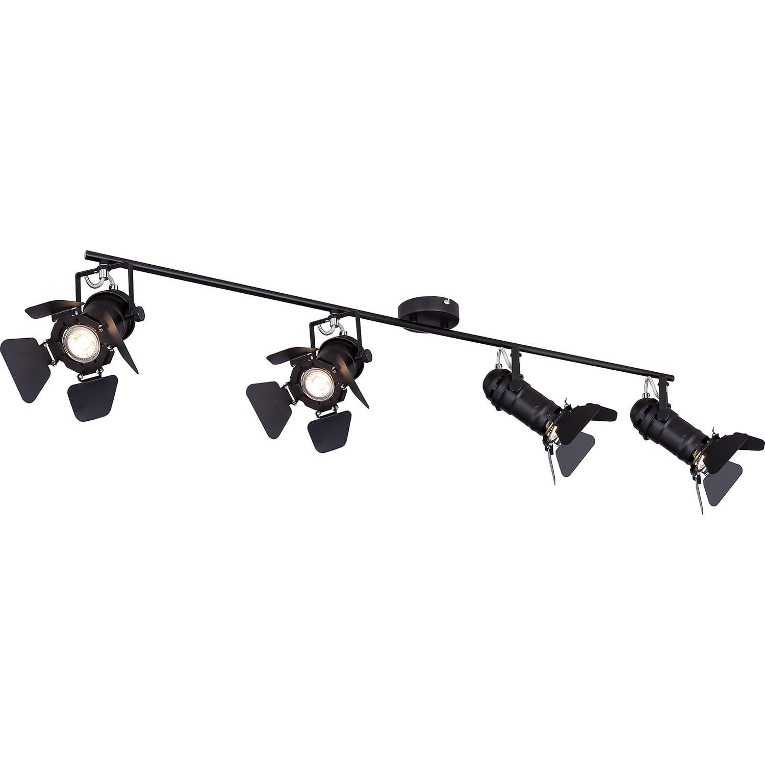 Ce projecteur en métal noir de la série EGON rappelle un décor de cinéma. Il y a quatre projecteurs à volets mobiles sur la barre droite. Cette lumière intérieure a une longueur totale de 125 cm. En choisissant librement la source de lumière (4 x GU10 / max. 50W), vous pouvez déterminer vous-même l'intensité lumineuse et la couleur de la lumière de cette lampe d'intérieur. En raison de leur longévité, nous recommandons les lampes LED. Avec d'autres modèles de cette série, vous pouvez encore améliorer l'apparence de votre espace de vie.
