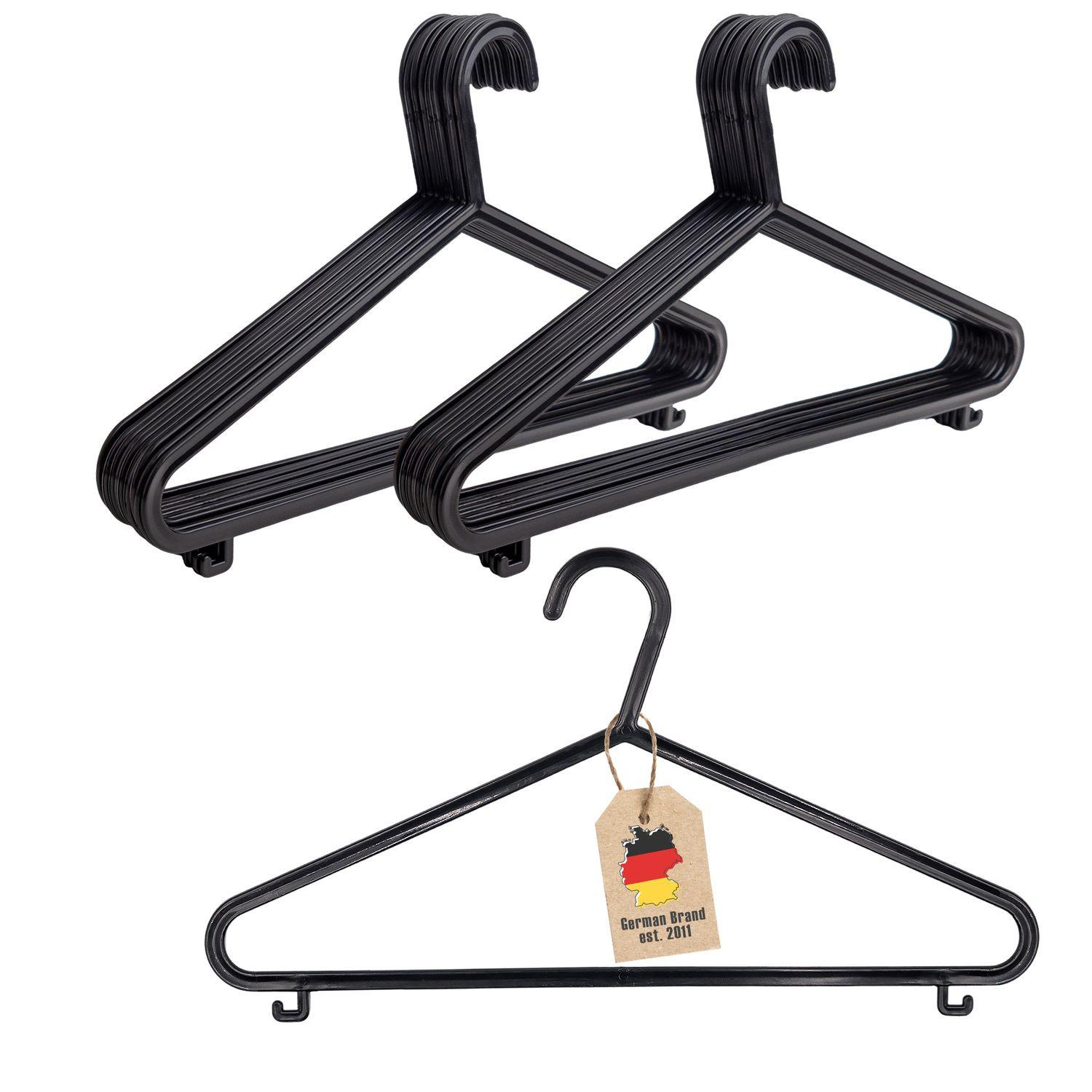 20 cintres fins et ergonomiques en plastique robuste de haute qualité, de couleur noire. Ils sont légers, peu encombrants et maintiennent les vêtements et les tissus en pleine forme.