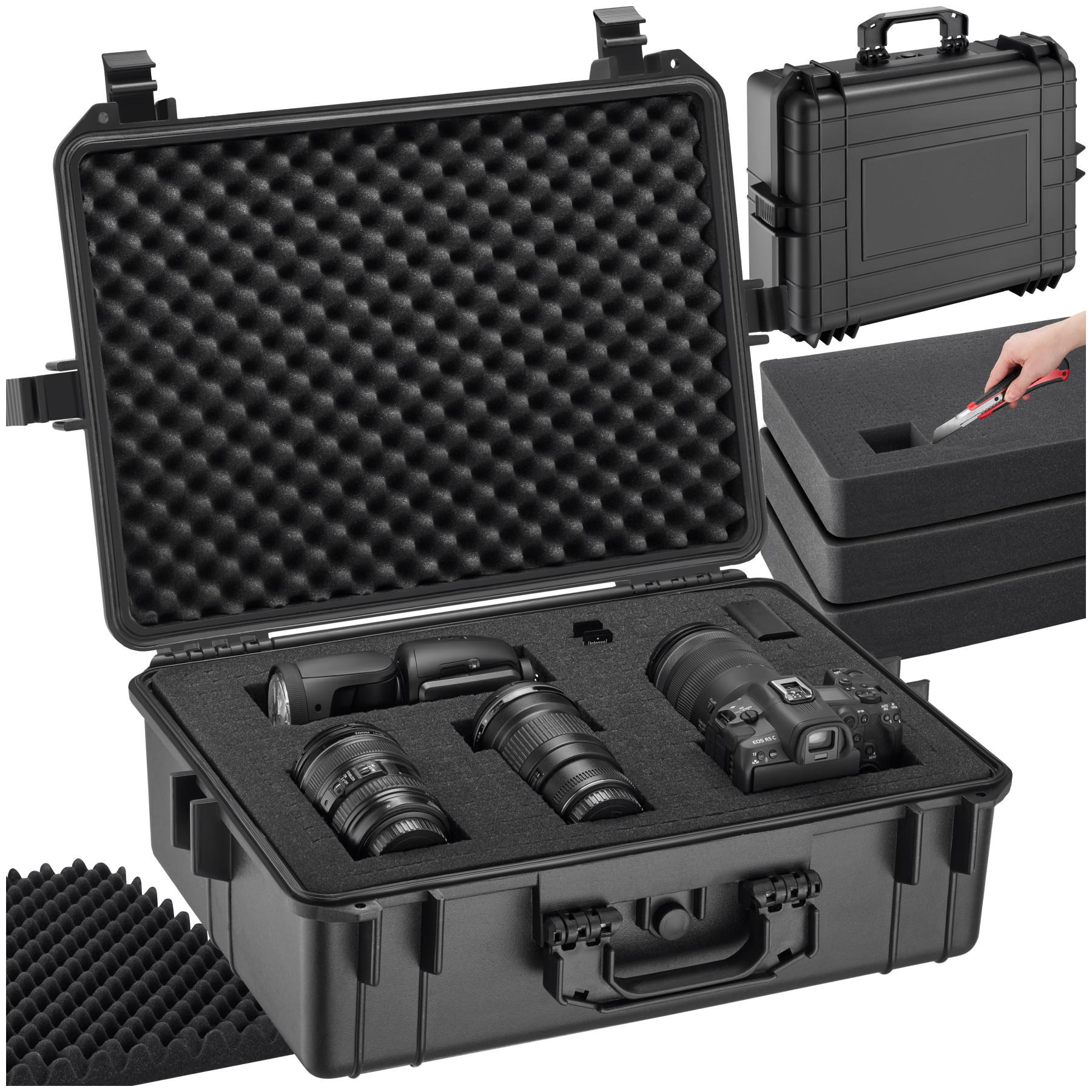 Mallette pour appareil photo et caméra, étanche + 4 inserts en mousse 56 cm x 42 cm x 21 cm noir TECTAKE. Cette valise de qualité est parfaite pour transporter en toute sécurité votre caméra, votre appareil photo (numérique ou non numérique) et vos différents appareils de mesure. Elle fournit suffisamment de place pour de grands appareils photographiques. On peut y ranger un appareil photo Reflex, un appareil photo numérique, une caméra ou encore des lampes flash fragiles. Cette mallette est entièrement sécurisée grâce à sa serrure à 4 points. Les 4 différents inserts en mousse vous permettent de bien protéger l'objet que vous placez dans la valise. La mallette pour caméra est étanche, résistante aux alcalins et aux acides et possède une soupape compensatrice de pression.