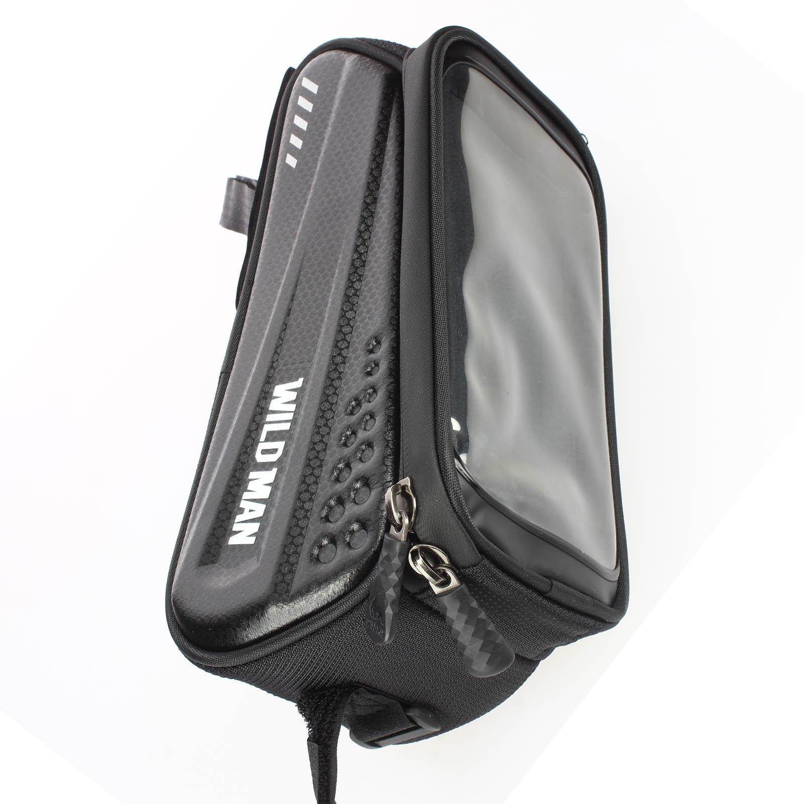 Sac de vélo, série ES3 de Wildman. Revêtement étanche. Double fermeture éclair. Capacité 1L avec fenêtre d'affichage. Format compact. Fixations en scratch sur cadre. Logo et bandes réfléchissants. Compatible avec téléphone taille maximale de 155 x 31 mm.