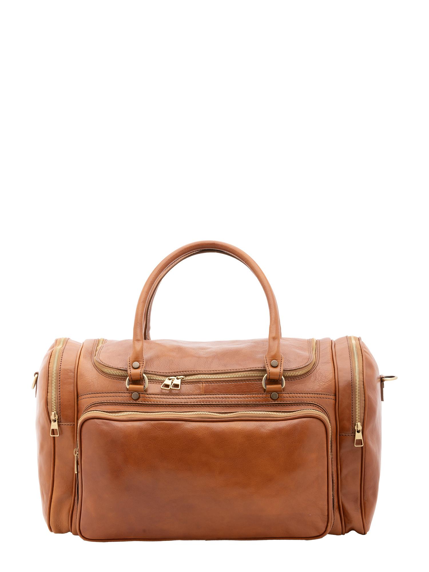 Sac de voyage unisexe. La fermeture est avec zip. Les poches intérieures sont une avec fermeture éclair. Les poches extérieures sont une sur le devant avec fermeture éclair et deux poches latérales avec fermeture éclair. La bandoulière est réglable et amovible en cuir. La poignée est en cuir. Il y a un compartiment interne. Le matériau extérieur est 100 % cuir véritable. À l'intérieur, il est doublé de coton. Dimensions : 52x37x29 cm. Fabriqué en Italie