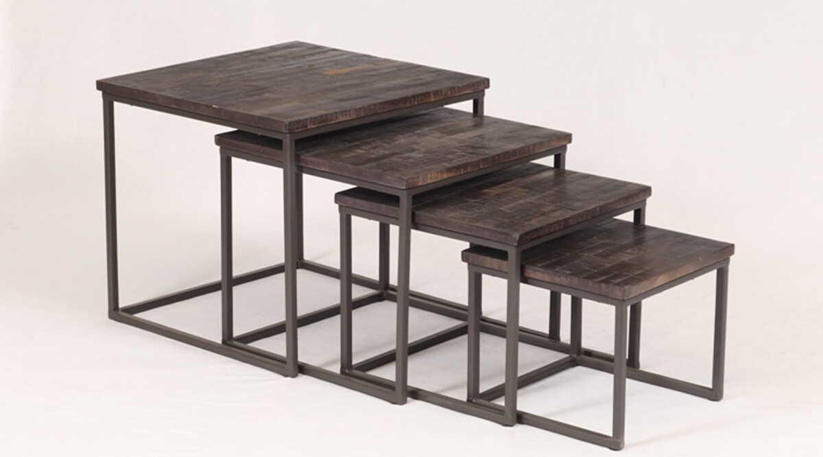 Table d'appoint en teck recyclé et métal, couleur gunmetalgrande table : 50 x 50 x 45 cmmoyennestables : 43 x 43 x 39 cm, 37 x 37 x 33 cmpetitetable : 31 x 31 x 27 cm