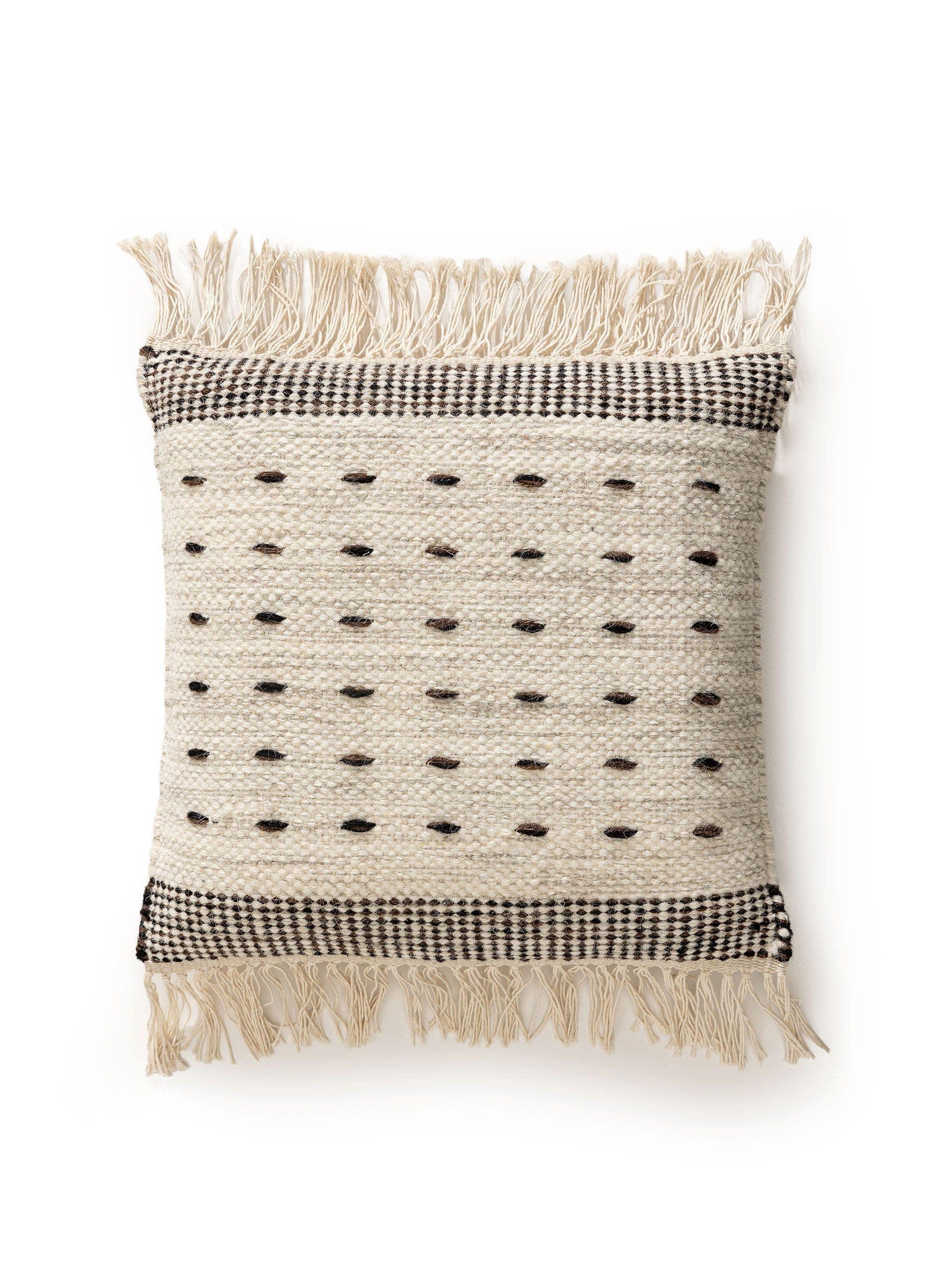 La housse de coussin Bahati présente un design distinctif noir et blanc, ajoutant une touche d'élégance moderne à tout espace de vie. Sa surface texturée et ses détails de franges créent une esthétique douillette et accueillante.