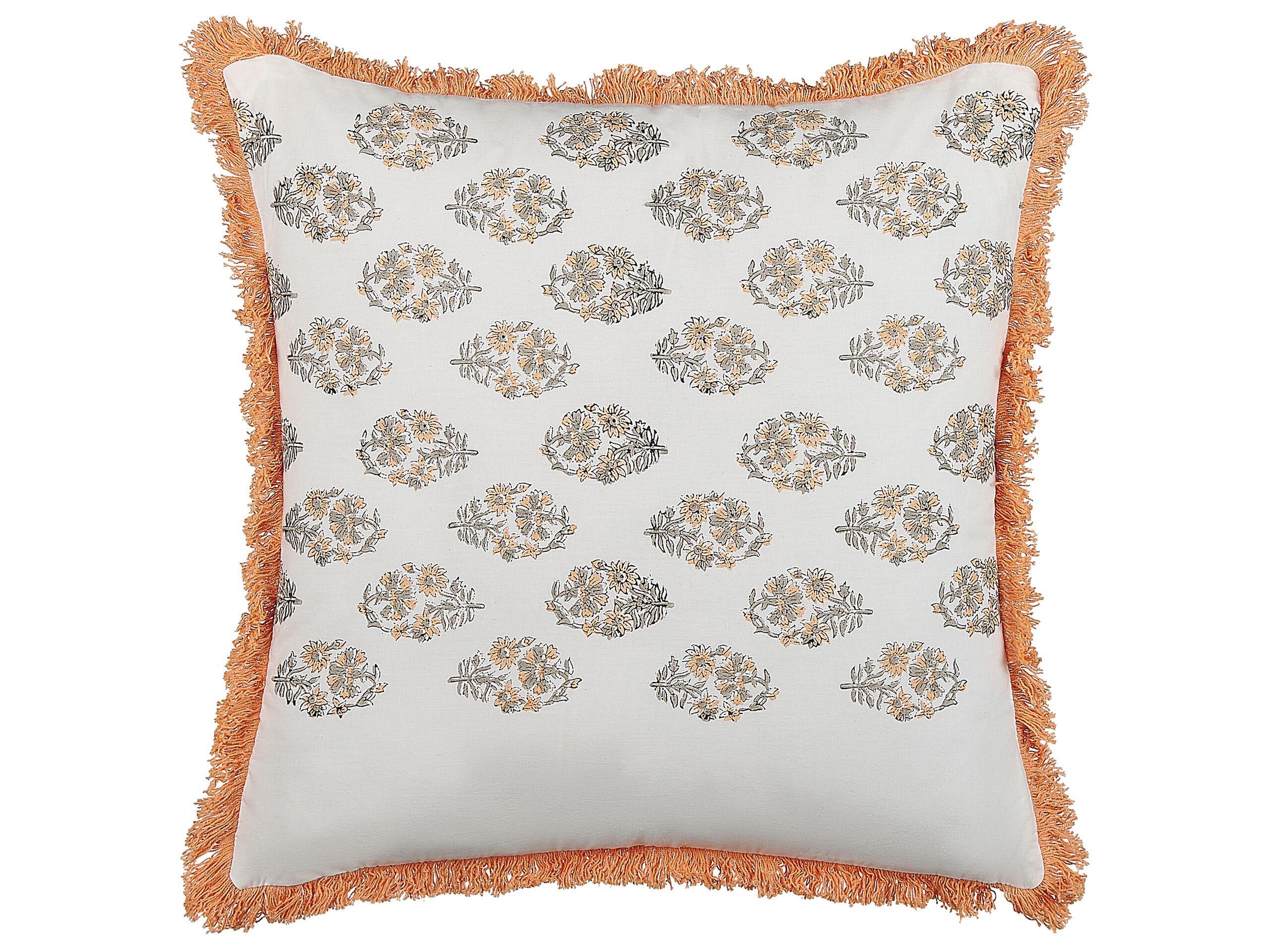 Coussin décoratif à franges. Relookez votre intérieur avec ce coussin décoratif. Son motif floral imprimé en bloc à la main est souligné par des bords frangés de couleur orange. Le coussin est fabriqué en coton et comporte un rembourrage en polyester et une fermeture à glissière.