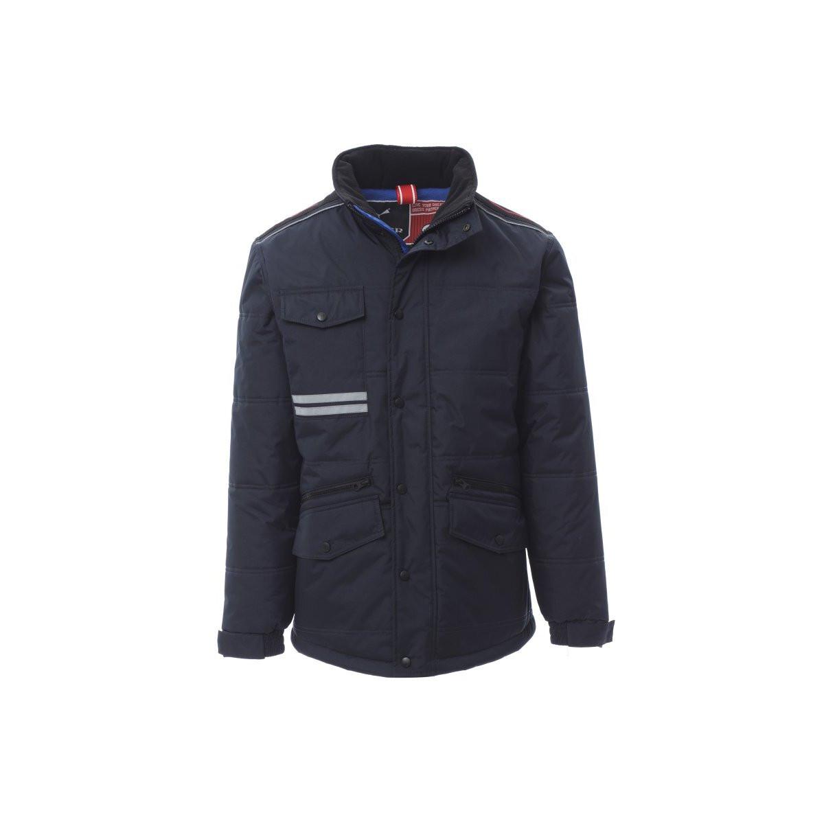 Ce blouson homme 3/4 est doté d'un zip en plastique de 8 mm avec curseur en métal, d'un rabat et de boutons en plastique. Il présente un dos profilé et une capuche dissimulable dans le col. La veste comprend deux poches extérieures LOCK SYSTEM, deux poches zippées et des poches obliques pour faciliter l'insertion des mains. Une poche de poitrine pour smartphone et un anneau porte-badge sont également présents, ainsi que des passepoils réfléchissants sur la poche et dans le dos.