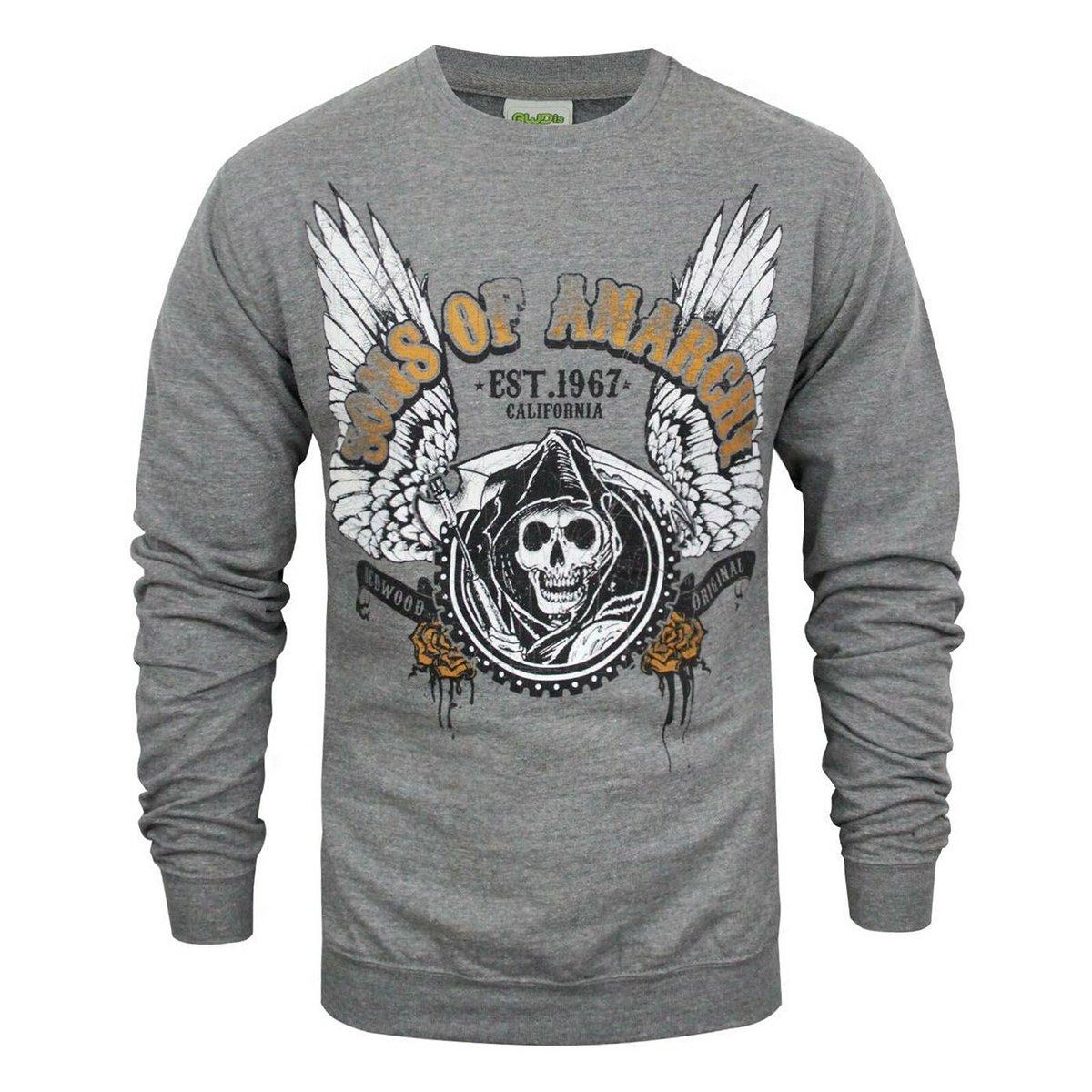 Ce chandail officiel Sons Of Anarchy pour hommes présente un motif saisissant de faucheur avec des ailes. Il a un aspect usé et un toucher agréablement doux. Le chandail est conçu avec un col rond et des manches longues, offrant une coupe standard.