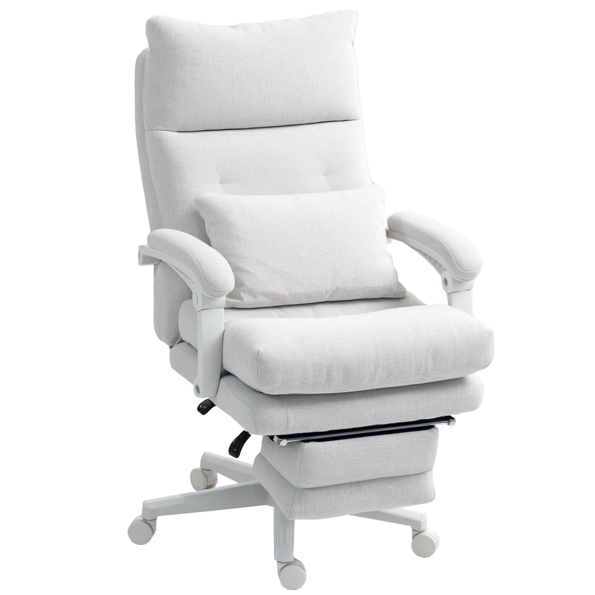 Profitez du confort luxueux de la chaise de bureau HOMCOM, une combinaison parfaite de style et de confort. Le fauteuil pivotant offre une assise et un dossier respirants de 20 cm d'épaisseur en tissu semblable au lin et est rempli de coton synthétique doux, garantissant un confort inégalé. Avec une inclinaison de 160° et un repose-pieds intégré, il est idéal pour s'adosser et se détendre dans votre salon après de longues journées.