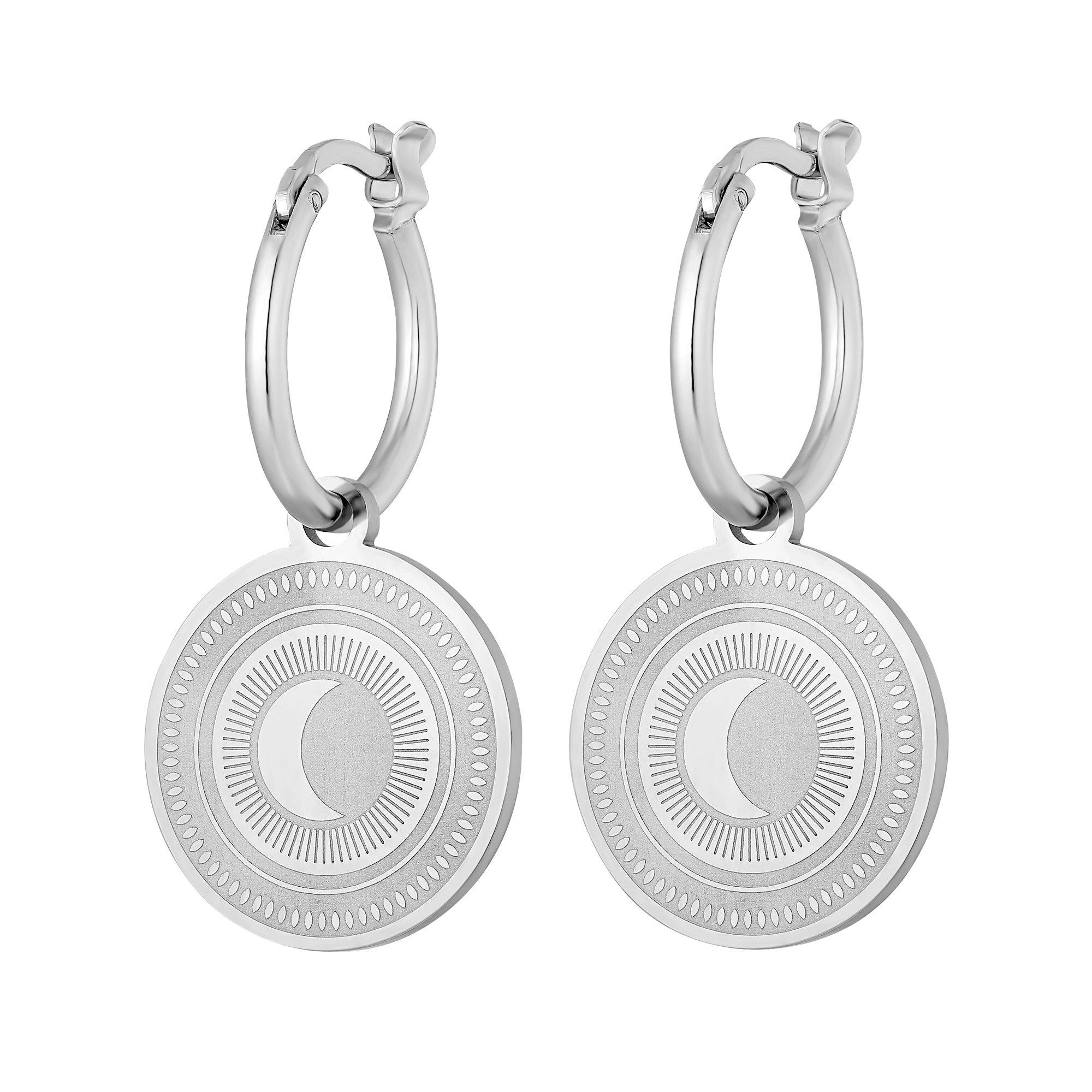 Here comes the sun ! Ou la lune ? Dans ces créoles, le jour et la nuit se rencontrent et montrent l'alternance du soleil et de la lune. Les boucles d'oreilles avec les pendants ronds fascinent par leur gravure à l'effet magique et s'accordent parfaitement avec le boho-chic, les robes estivales légères et les looks de fête décontractés.