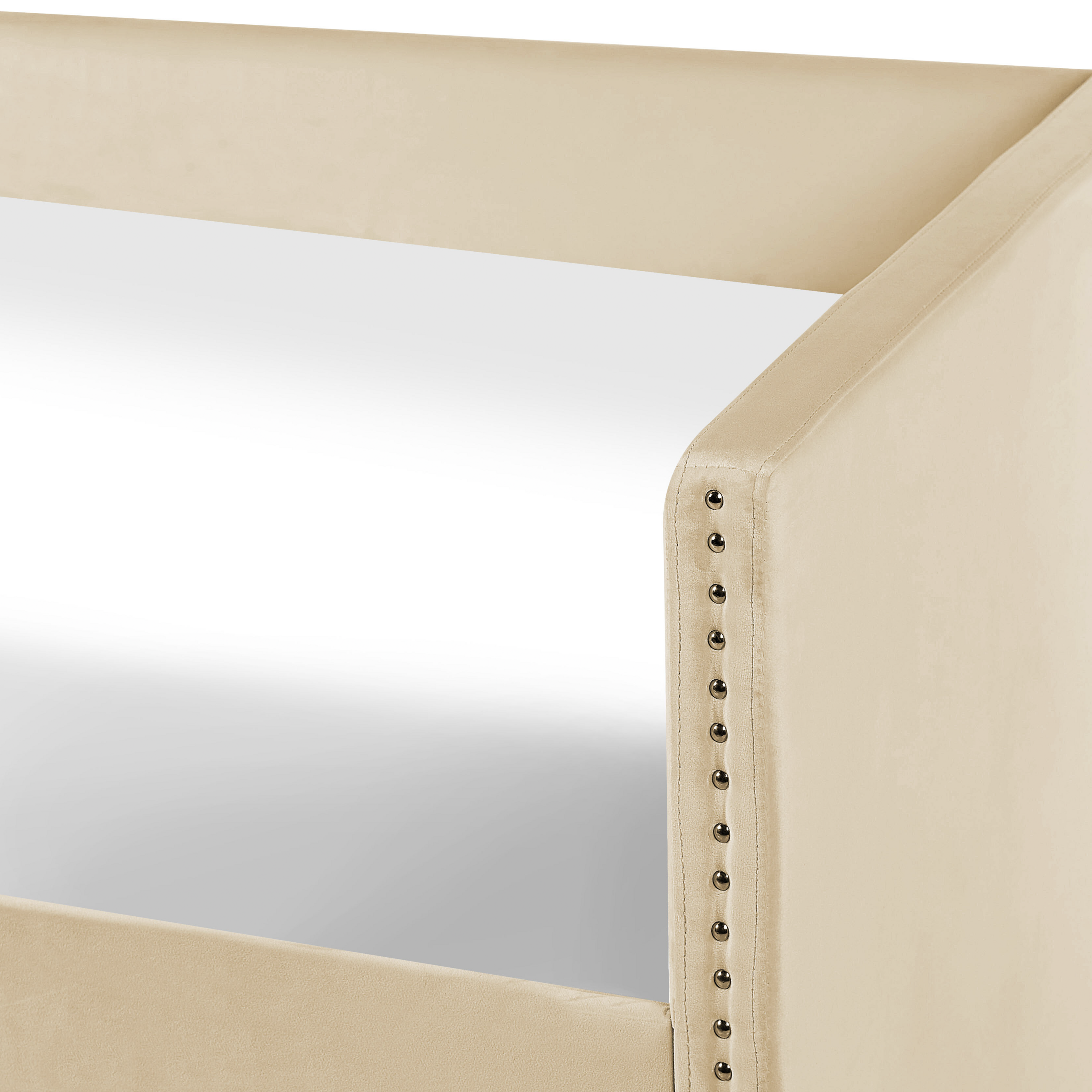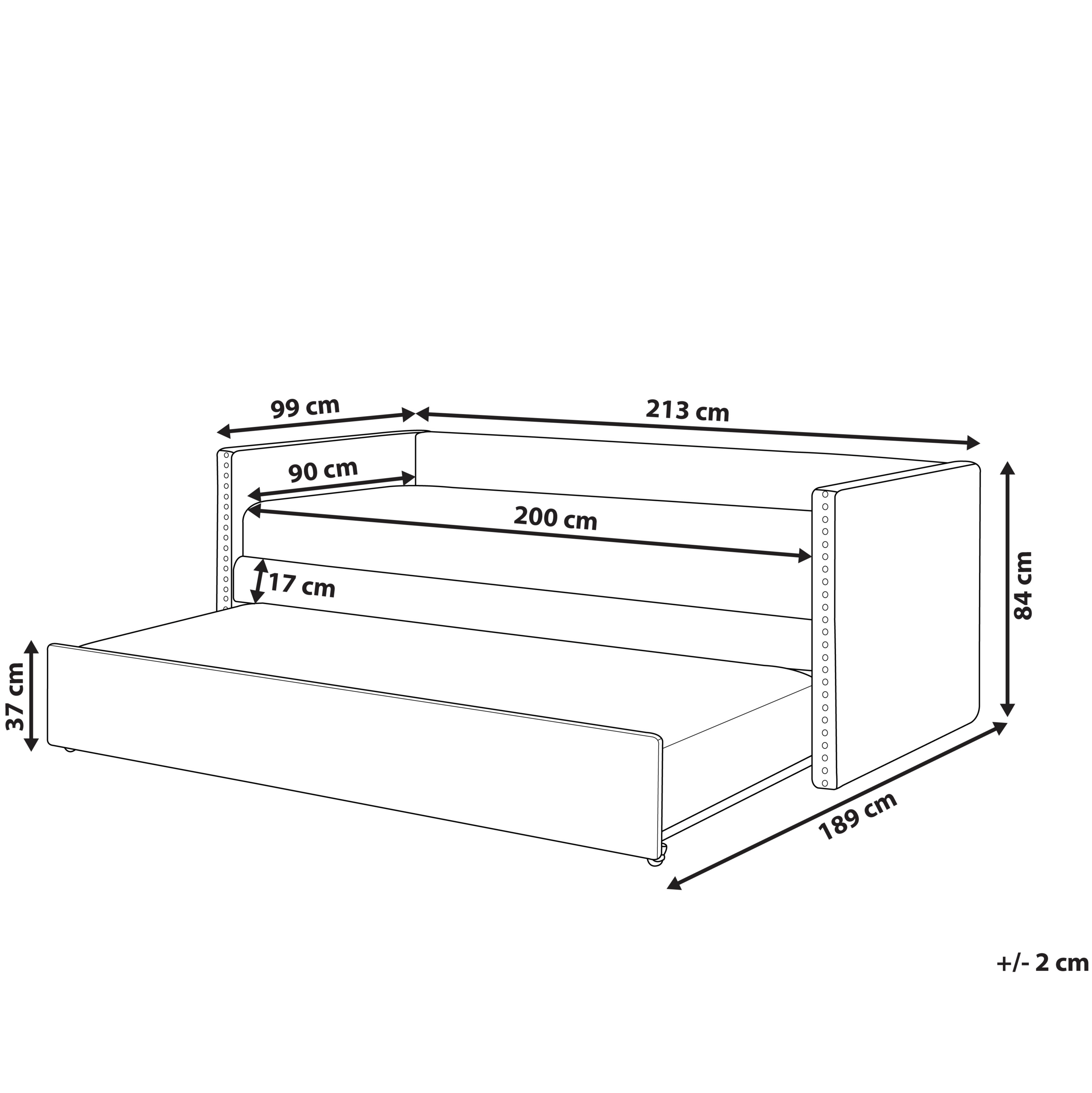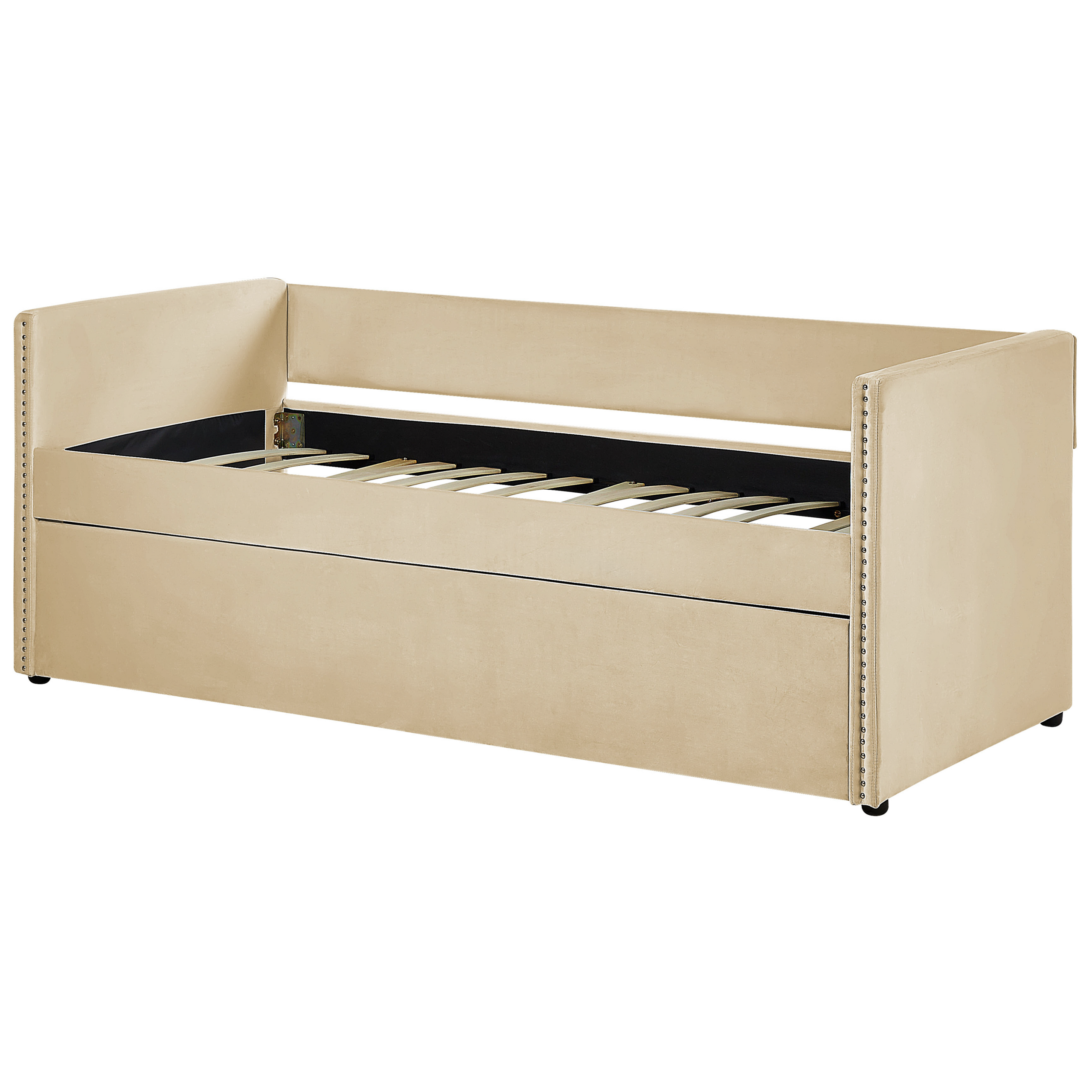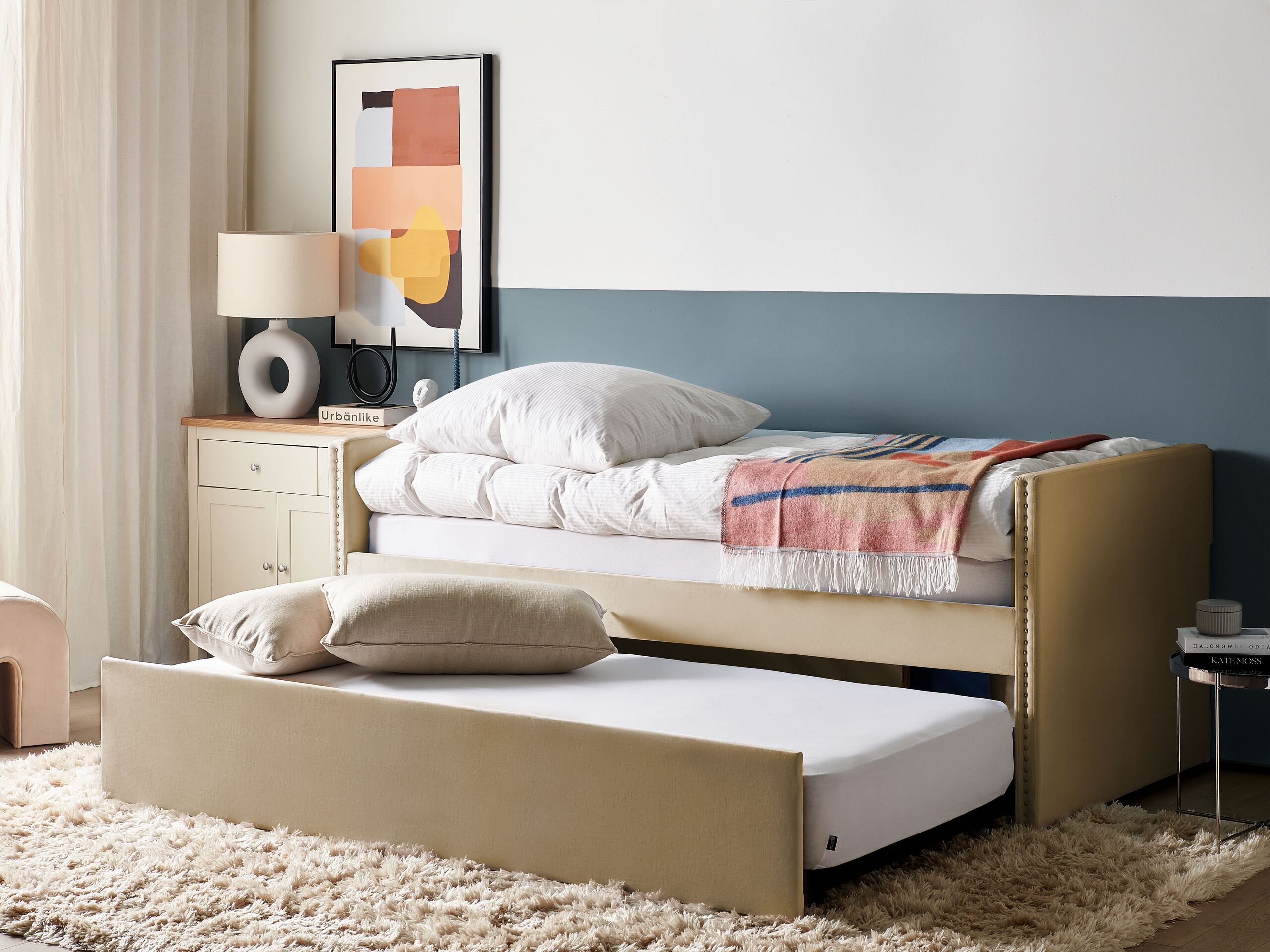Lit avec tiroir. Un lit gigogne est un choix pratique pour les espaces limités, surtout sils doivent accueillir 2 personnes. En effet, c'est une solution particulièrement utile pour les chambres d'enfants partagées. Cette jolie banquette lit n'est pas juste fonctionnelle, elle est aussi un meuble élégant. Revêtue de velours et ornée de clous décoratifs, elle s'intègre parfaitement aux chambres moderne et glamour. Elle est équipée de lattes articulées en bois qui fournissent un support stable pour le corps et le matelas.