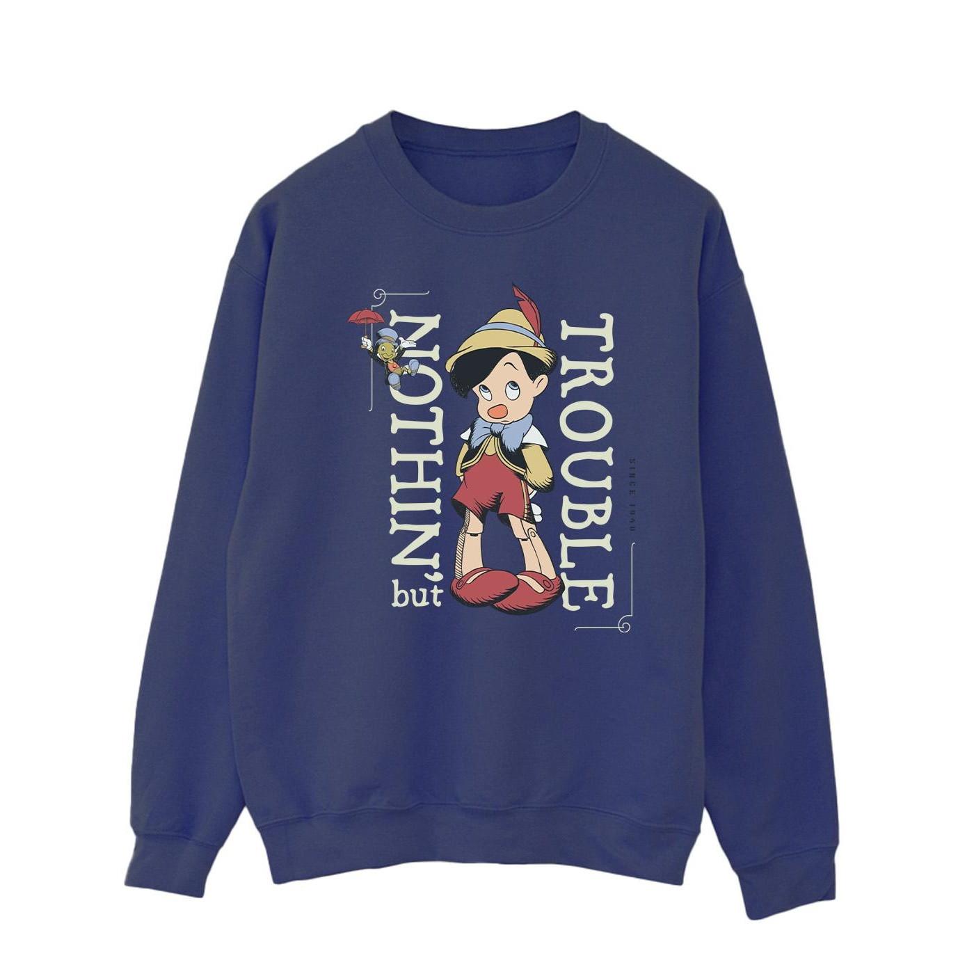 Ce sweatshirt présente un imprimé graphique ludique de Pinocchio et Jiminy Cricket, accompagné du texte « NOTHIN' but TROUBLE ». Le design ajoute une touche fantaisiste à un sweatshirt classique à col rond, en faisant un choix confortable et élégant pour les tenues décontractées.