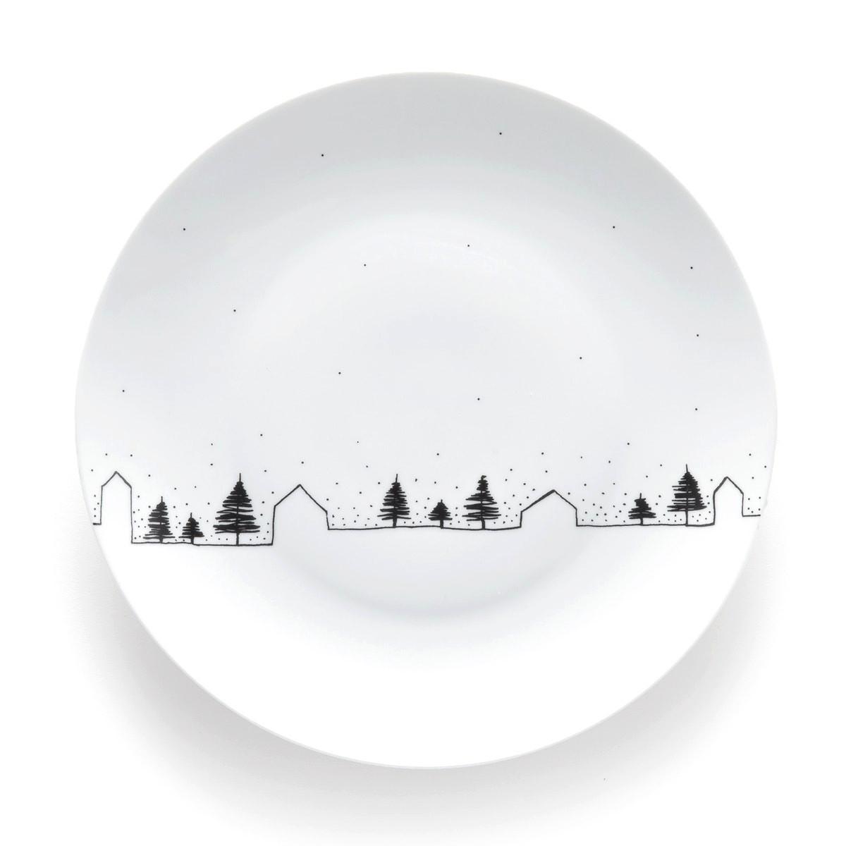 Les 4 assiettes plates MIWIN. Belle porcelaine blanche animée d’un paysage stylisé sous la neige.