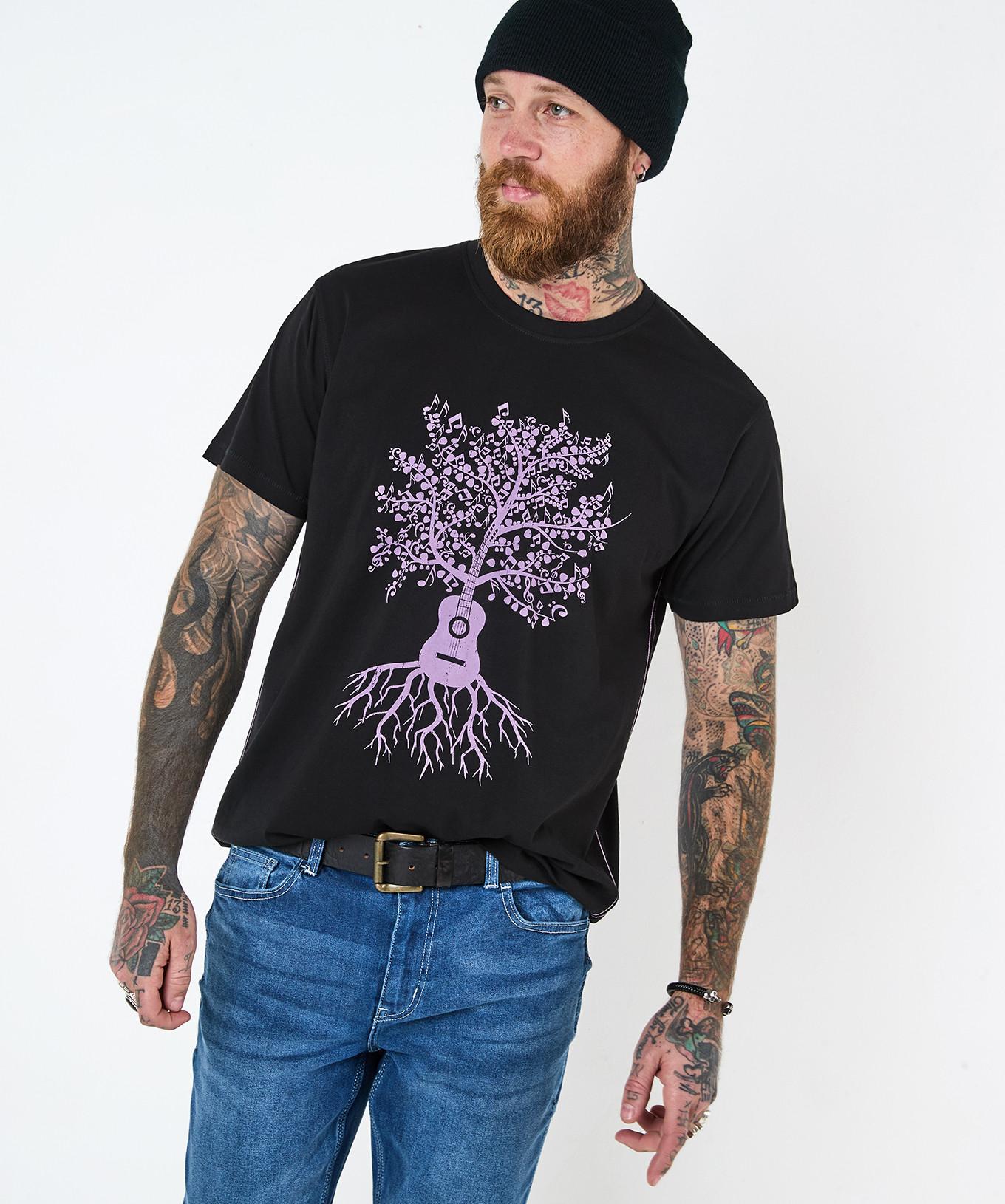 Ce t-shirt graphique Joe Browns présente un design unique d'une guitare formant le tronc d'un arbre, avec des notes de musique comme feuilles et des racines s'étendant en dessous. Le fond noir offre un contraste saisissant avec le graphique violet, faisant ressortir le design. Ce t-shirt est un incontournable pour tous les amateurs de musique.