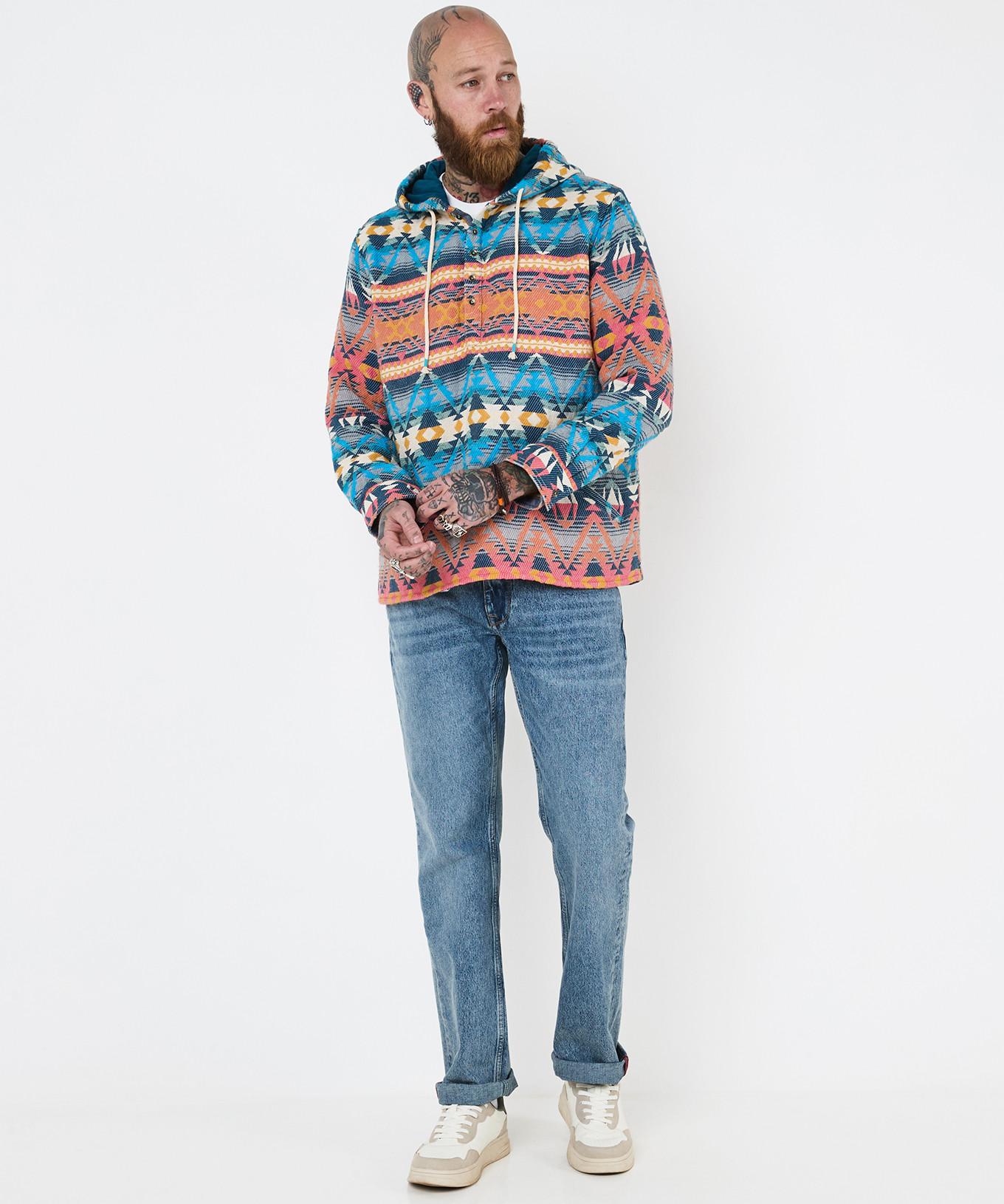 Ce sweat à capuche aztèque vif présente un motif saisissant qui ajoute une touche unique à toute tenue. Le design comprend une patte de boutonnage pour un confort ajustable et une capuche pour plus de chaleur et de style. C'est une pièce polyvalente adaptée à diverses occasions décontractées.