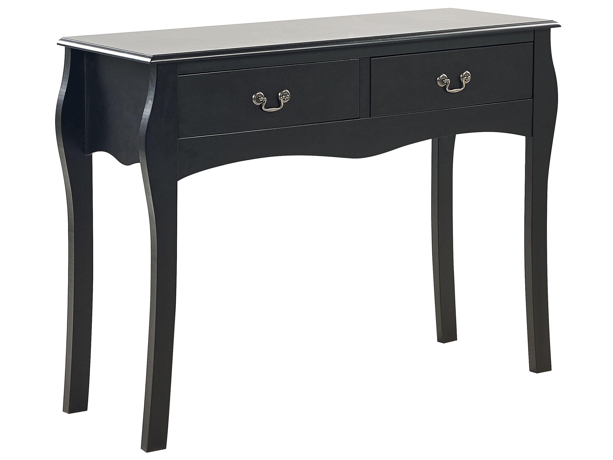 Console noire style maison de campagne . Complément fonctionnel et décoratif de toute entrée ou espace de vie, cette table rustique est un support idéal pour les livres, les décorations et les touches de style personnalisées. Avec son design élancé, ses pieds en cabriole et son tablier festonné à l'avant, cette pièce offre un attrait vintage et intemporel. Équipée de deux tiroirs spacieux, tous deux décorés de poignées métalliques classiques, cette table s'intègre parfaitement à tout décor de style campagne française et de style chic et désuet.
