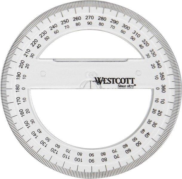 Winkelmesser Der Kreis-Winkelmesser von WESTCOTT aus transparentem Kunststoff verfügt über eine äußere Bezifferung rechtsläufig von 0°-360° und eine innere Bezifferung links- und rechstläufig von 0°-90°.