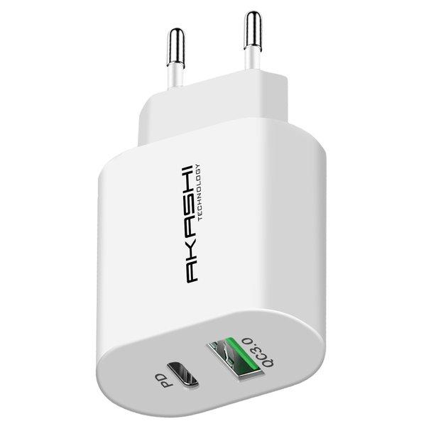 Chargeur secteur avec deux sorties USB-A + USB-C d'Akashi. Charge simultanée de vos appareils. Avec Power Delivery 20W et Quick Charge 3.0 18W. Design compact. Charge sécurisée. Compatible avec tous les appareils. Puissance totale 15W.