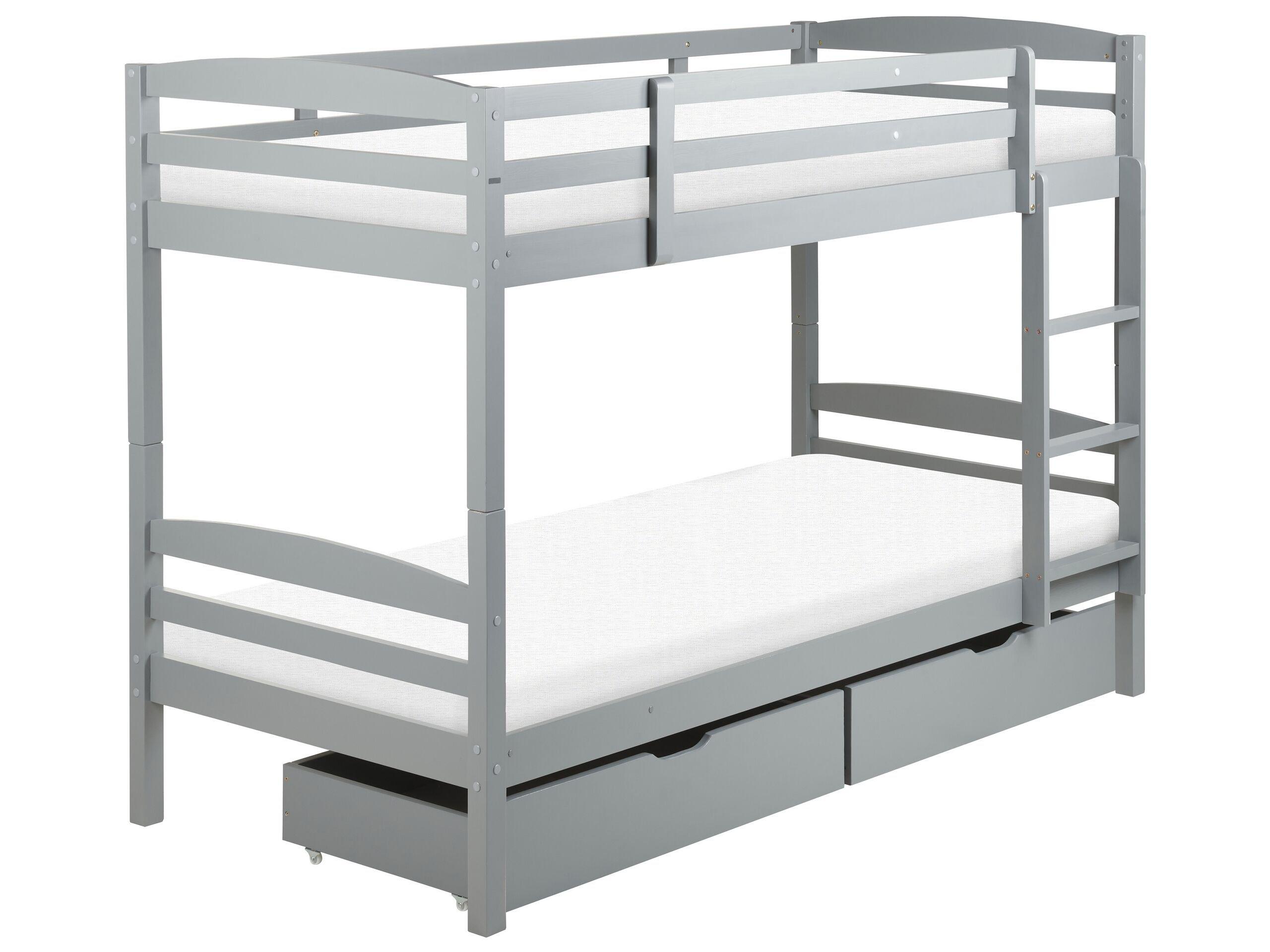 Lit à étage 2 places. Equipez la chambre de vos enfants de ce lit superposé ultra-fonctionnel et confortable. Fabriqué en bois de pin durable, avec des bords hauts, il durera de nombreuses années. L'échelle est facile à monter et le lit est équipé de deux tiroirs spacieux, qui peuvent être utilisés pour ranger des draps ou des oreillers supplémentaires. Avec son design classique et son cadre en bois peint en gris élégant, le lit s'intègre parfaitement à tout intérieur moderne ou scandinave. La hauteur recommandée pour le matelas du lit superposé supérieur est inférieure à 13 cm afin que les bords assurent une sécurité maximale.