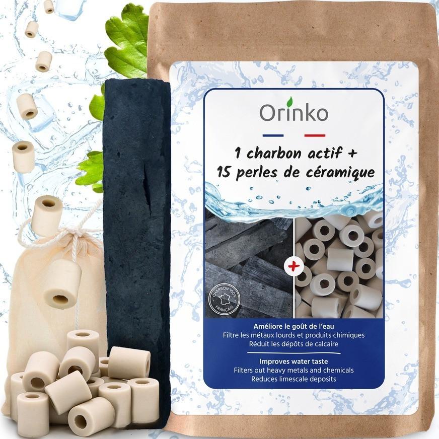Découvre la manière naturelle de purifier l'eau avec le kit de purification Orinko, qui combine du charbon actif 100% français et 15 perles céramiques EM® grises. Le charbon actif, fabriqué en France, adsorbe efficacement les métaux lourds et les produits chimiques de ton eau du robinet, tandis que les perles en céramique, fabriquées au Japon, réduisent les dépôts de calcaire. Cette synergie garantit une eau pure et savoureuse, exempte de substances indésirables.Le kit est conçu pour filtrer jusqu'à 1,5 litre d'eau. Le charbon actif offre une capacité de filtration de 6 mois, tandis que les billes de céramique durables sont efficaces jusqu'à 10 ans. Les deux composants sont 100% recyclables et compostables, ce qui en fait un choix écologique pour ton ménage. L'emballage est réalisé en France, dans un souci de durabilité.En achetant ce kit, tu soutiens également la protection de l'environnement : Orinko reverse 1% de son chiffre d'affaires à une ONG qui s'engage pour la reforestation de l'Amazonie. Offre-toi, ainsi qu'à ta famille, une eau propre et naturellement filtrée tout en contribuant à la protection de notre planète. Commande dès maintenant le kit de purification Orinko et découvre la différence !