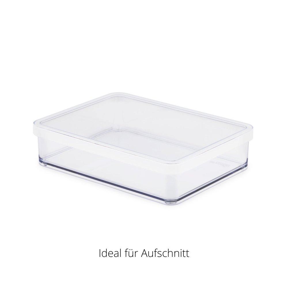 Grâce à leur design hautement transparent, il est facile de voir ce qu'il y a à l'intérieur, que ce soit par le haut ou par le côté - les récipients sont donc également idéaux pour les tiroirs ou les armoires situées en hauteur.