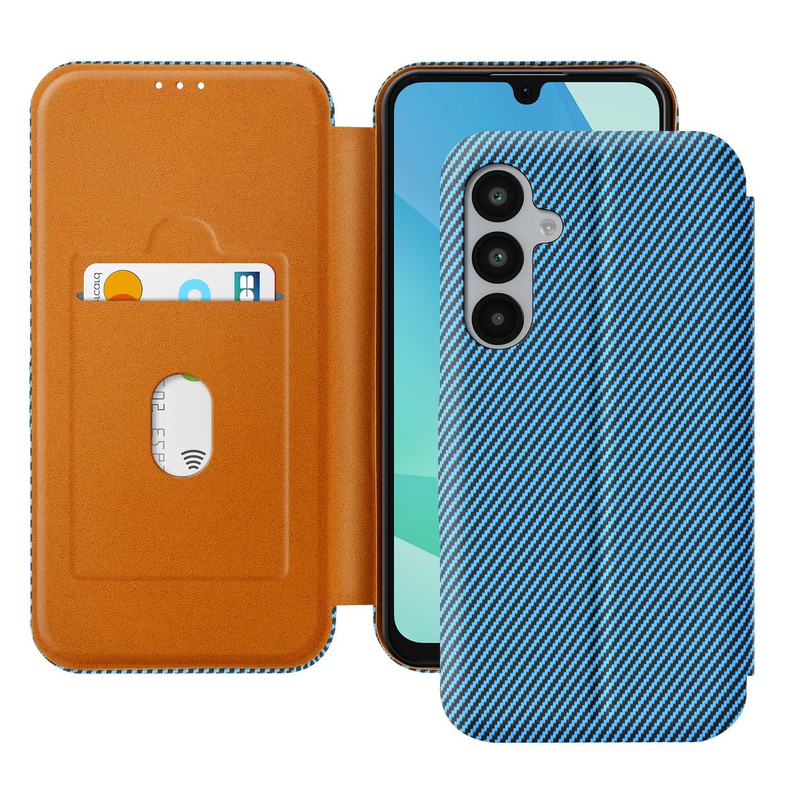Étui folio pour Samsung Galaxy A16. Design effet fibre de carbone. Porte-carte intégré avec protection anti-RFID. Support vidéo intégré. Fermeture magnétique sécurisée. Protection optimale contre les chocs, rayures. Mince et ergonomique avec courbure sur les bords. Accès facile aux boutons et ports.