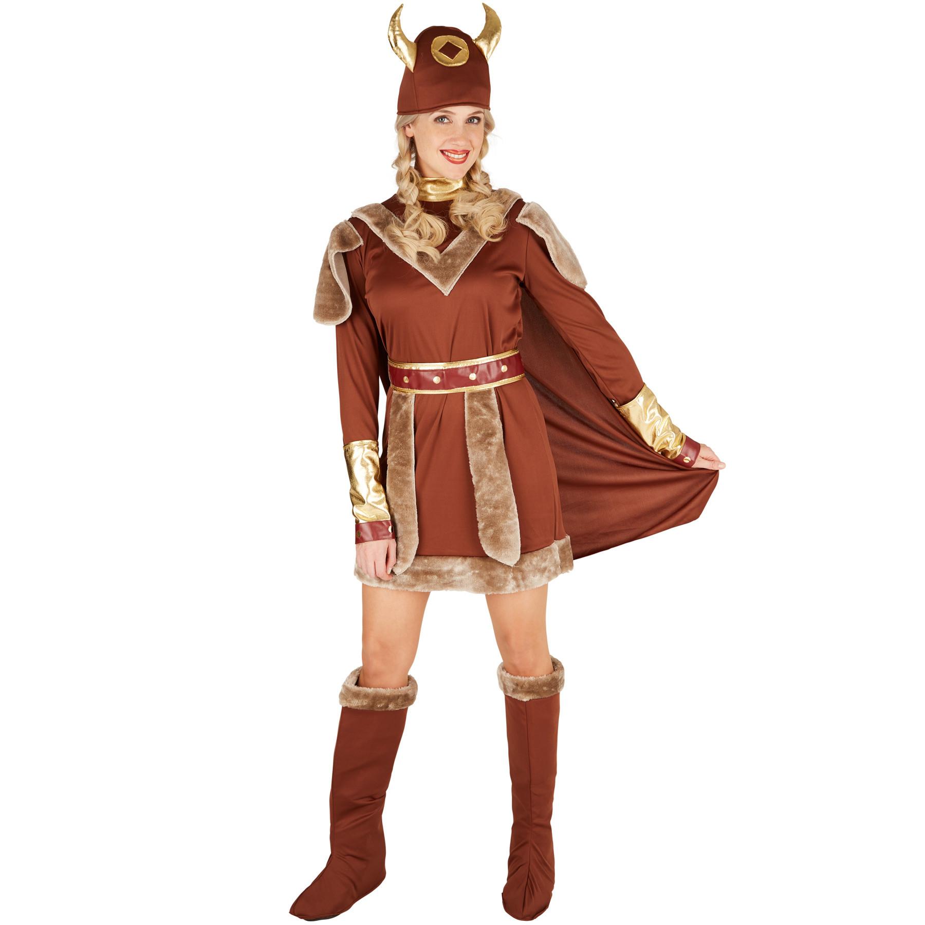 Le costume de femme chef viking se compose d'une robe avec cape, d'une ceinture, d'un chapeau et de revers de botte montant au niveau du genou. Matériau : 100 % polyester.