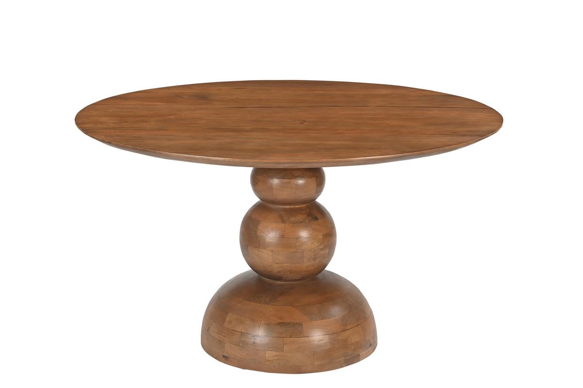 Matériau : bois de manguier massif Couleur : brun naturel Diamètre : 130 cm Forme : Plateau de table rond Épaisseur du plateau : 2,5 cm avec bord suisse Piètement stylé et géométrique Hauteur : 76 cm