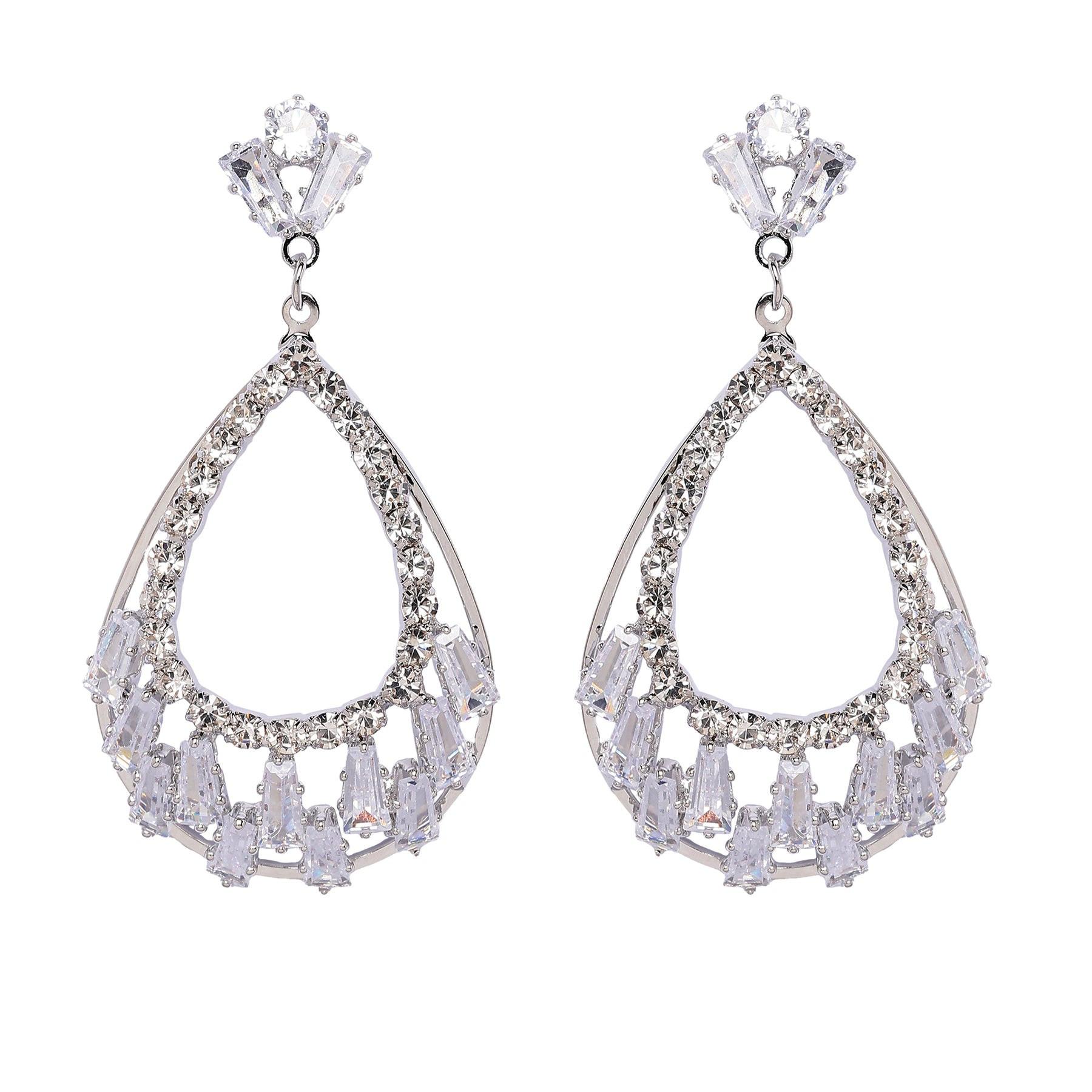 Ces boucles d'oreilles éblouissantes présentent un magnifique design en forme de larme, orné d'une cascade de pierres scintillantes. Véritable pièce maîtresse, elles respirent l'élégance et le charme. Dimensions : 2,6 cm x 5,2 cm | Placage : Rhodium | Fermoir : Tige et ardillon