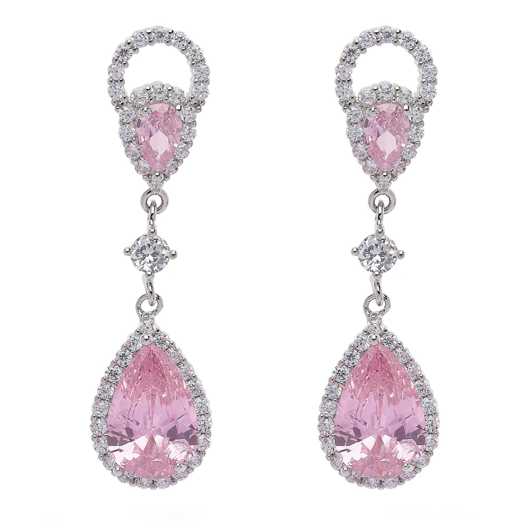 Ces délicates boucles d'oreilles pendantes arborent une palette douce et romantique. Un anneau serti de cristaux surplombe une pierre rose en forme de poire, reliée par une fine chaîne ornée d'un cristal central. Le bijou se termine par une pierre rose plus grande, en forme de larme, entourée d'un halo étincelant de cristaux, pour une touche d'élégance féminine. Dimensions : 1,0 cm x 4,0 cm | Placage : Rhodium | Fermoir : Tige et ardillon