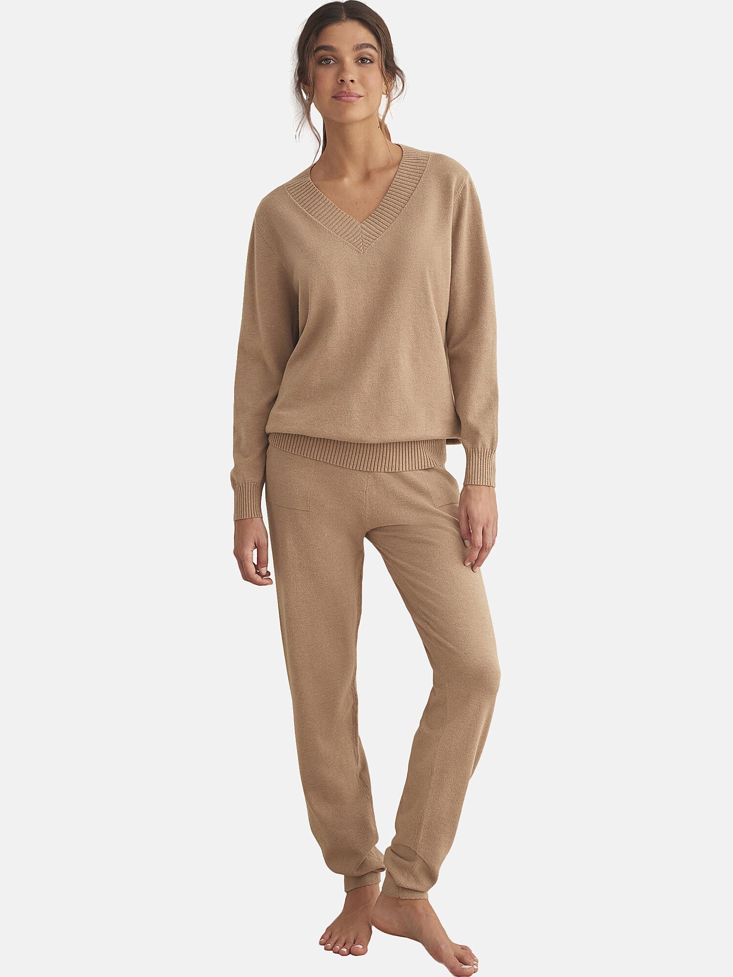 Son tissu tricoté est doux et agréable à porter tout en gardant au chaud. Il a reçu un traitement anti-boulochage pour préserver le tissu et assurer un design parfait lavage après lavage. Le haut à manches longues a un col V féminin et des finitions en mailles côtelées au col, à la taille et aux poignets. Le pantalon a une taille réglable grâce à un cordon de serrage et des poches latérales qui le rendent pratique. Il est resserré au niveau des chevilles pour un port plus pratique et confortable.