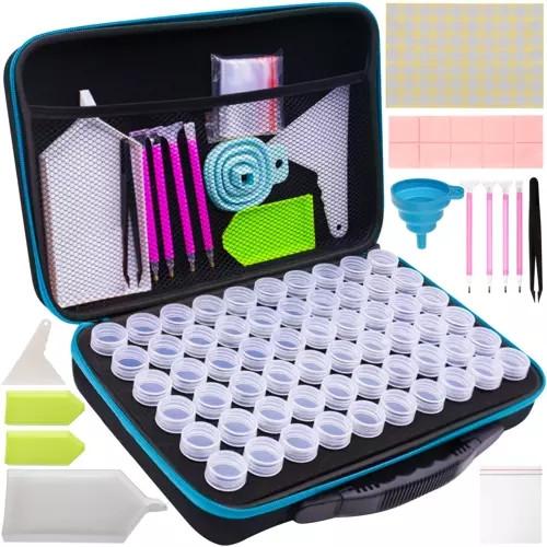 - COFFRET PRATIQUE AVEC UNE POIGNÉE - Les accessoires de broderie diamant sont un excellent moyen de garder l'ordre tout en jouant avec la broderie. Le tout est emballé dans un étui rigide comme une valise . Les bocaux en diamant sont placés dans un moulage spécial et il y a une poche pour le reste des accessoires. De plus, l'étui est doté d'une poignée pratique qui facilite le transport de l'ensemble.