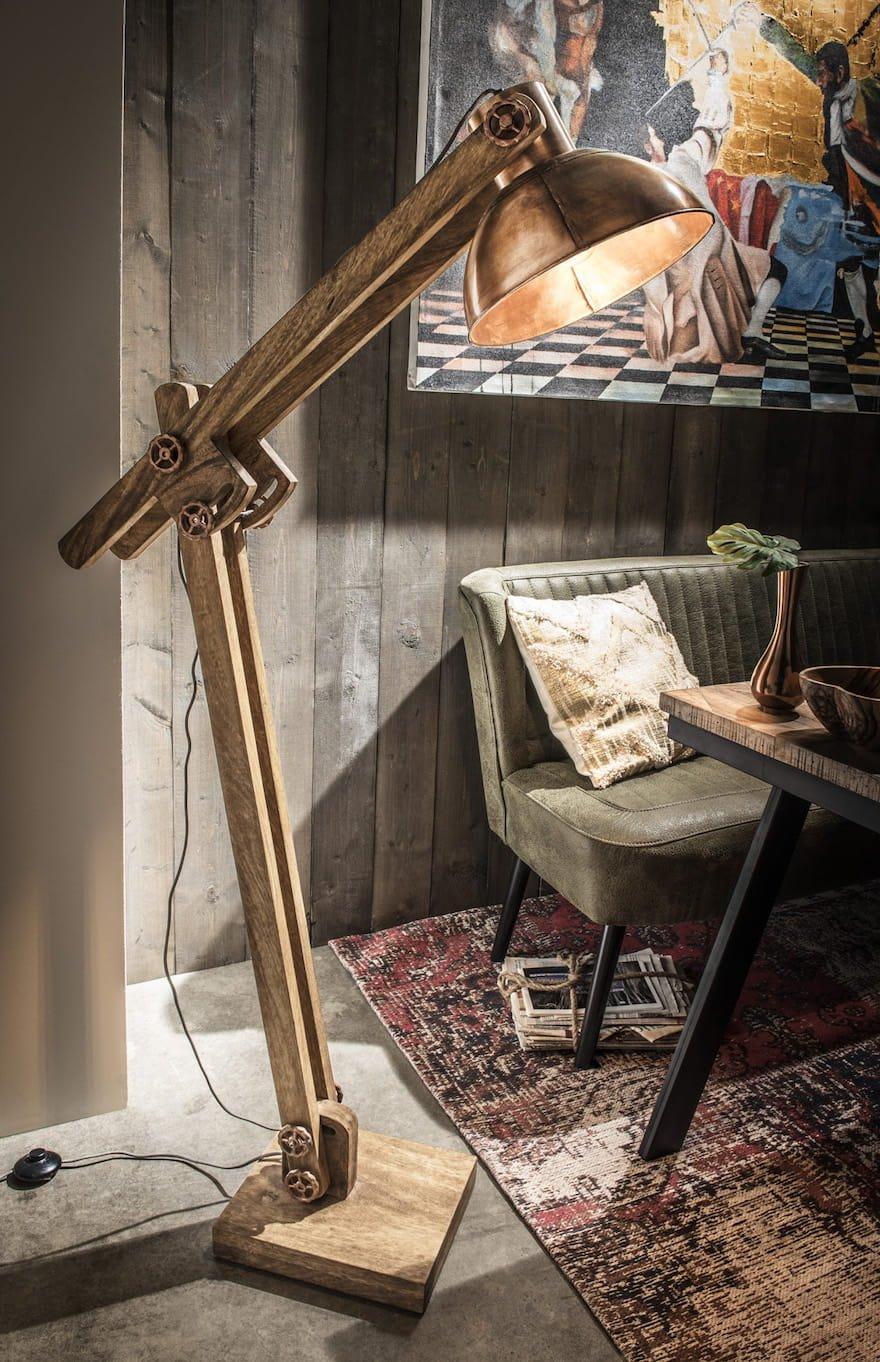 Lampadaire flexible en bois de manguier et métal couleur cuivre.