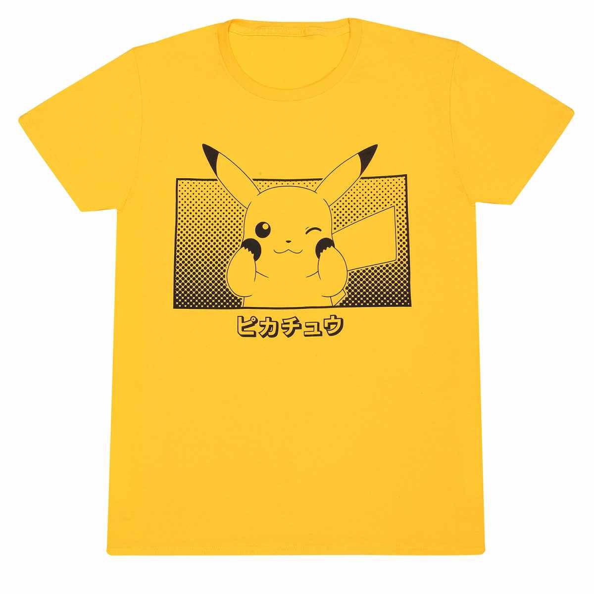 Ce T-shirt présente un graphique ludique de Pikachu, le personnage emblématique de Pokémon, sur un fond avec un motif de points en demi-teinte. Sous le graphique, le nom "Pikachu" est écrit en caractères japonais Katakana, ajoutant une touche authentique au design. Le T-shirt à manches courtes offre une coupe confortable, le rendant adapté à un usage quotidien.