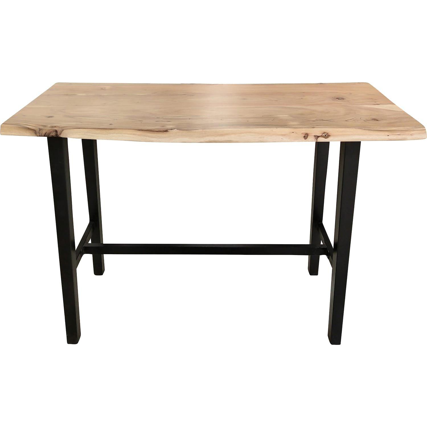 Table haute en acacia avec arête d'arbre comme si elle avait poussé, épaisseur du plateau 26 mm, plateau naturel, piétement en acier noir antique, 124,5x51x112