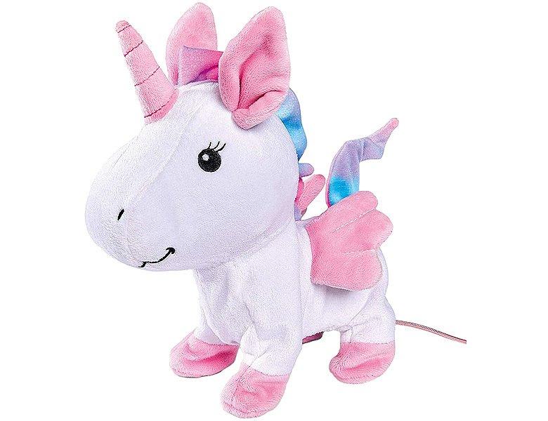 Das bezaubernde Einhorn kann sich kabellos bewegen und richtig laufen. Die kabelgebundene Fernbedienung ermöglicht eine einfache Steuerung. Mit einer bunten Mähne und einem farbenfrohen Schweif begeistert das 20 cm grosse Plüschtier. Das Horn, die Flügel, die Ohren und die Hufe sind in einem ansprechenden Rosa gehalten. Ein magischer Sound ertönt bei Knopfdruck.