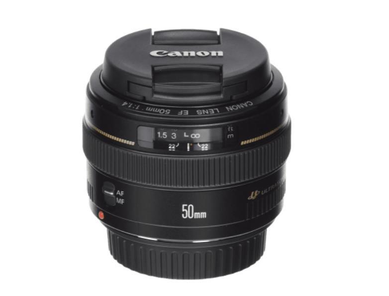 Marque Canon Type Fixe Caractéristiques Téléphoto Monture Canon EF Distance focale fixe 50 mm Ouverture maximale f/1.4 Général Longueur 5.1 cm Diamètre 7.4 cm Poids 290 g Système de lentilles Conçu pour SLR numérique, reflex numérique plein cadre Distance focale 50 mm Ouverture minimum F/22 Grossissement 0.15 Distance de mise au point minimum 45 cm
