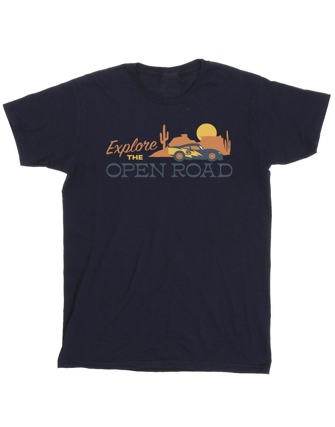 Ce T-shirt présente un imprimé graphique inspiré du film Cars, représentant un paysage désertique avec une voiture de course et le texte « Explore The Open Road ». C'est un ajout confortable et élégant à toute garde-robe décontractée.