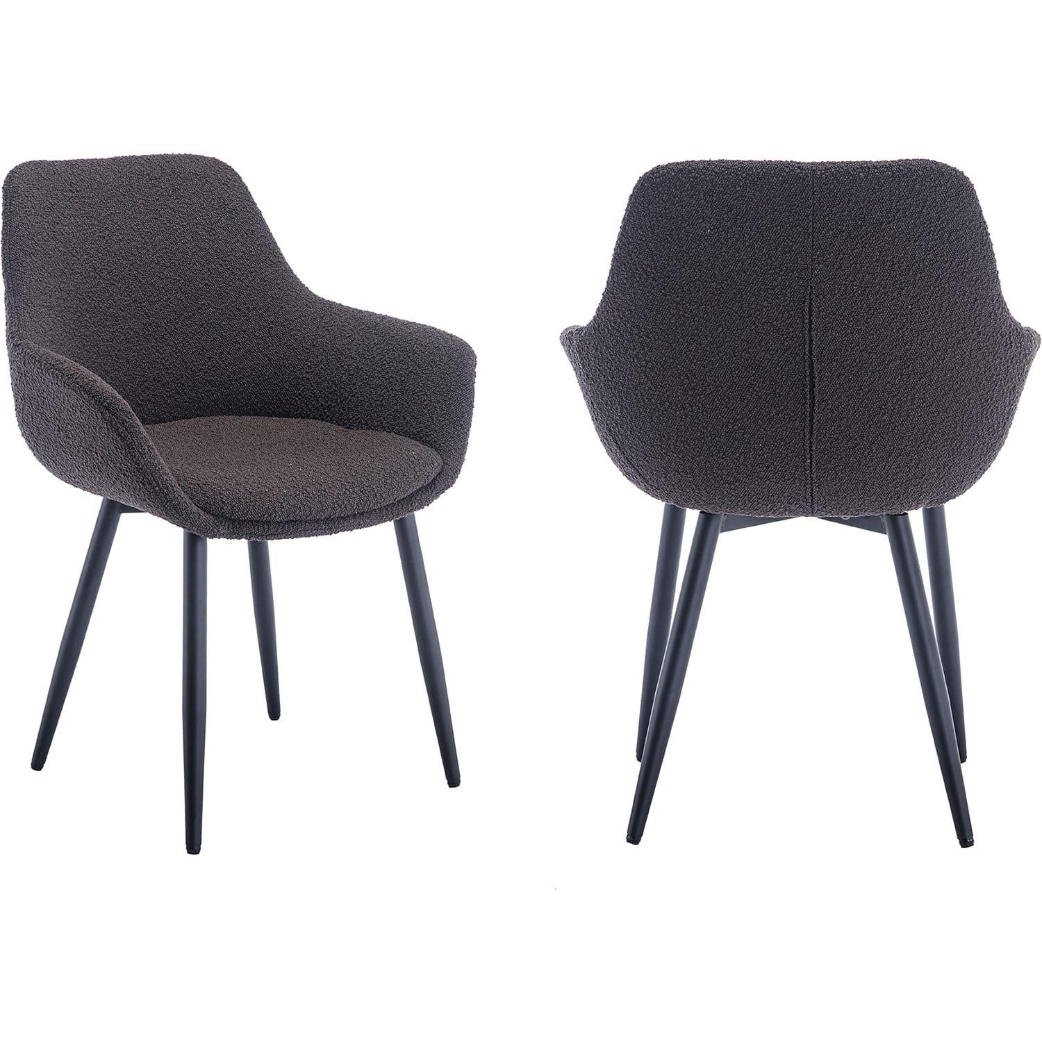 Ce set de 2 chaises modernes à accoudoirs séduit par son tissu texturé à l'aspect bouclé. Le piètement robuste à 4 pieds en métal revêtu par poudre en noir mat garantit une bonne stabilité et offre un magnifique contraste avec le revêtement de la chaise. Le dossier arrondi et le rembourrage agréable offrent un confort d'assise de première classe. Les accoudoirs évasés constituent un point fort visuel. Grâce à leur design stylé, ces chaises peuvent être utilisées dans la salle à manger, comme siège dans la salle d'attente ou dans une salle de conférence. Mais ce meuble attire également tous les regards lorsqu'il est utilisé seul. Vous et vos invités allez adorer votre nouveau siège.Pieds de chaise en métal (acier)Hauteur d'assise : env. 47 cmLargeur d'assise : env. 44 cmProfondeur d'assise : env. 44 cmHauteur des accoudoirs : env. 61 cmLargeur entre les accoudoirs : env. 64 cmcapacité de charge max. env. 110 KGaccoudoirs évasés pour un confort d'assise optimalpiétement robuste à 4 pieds en métal revêtu par poudre