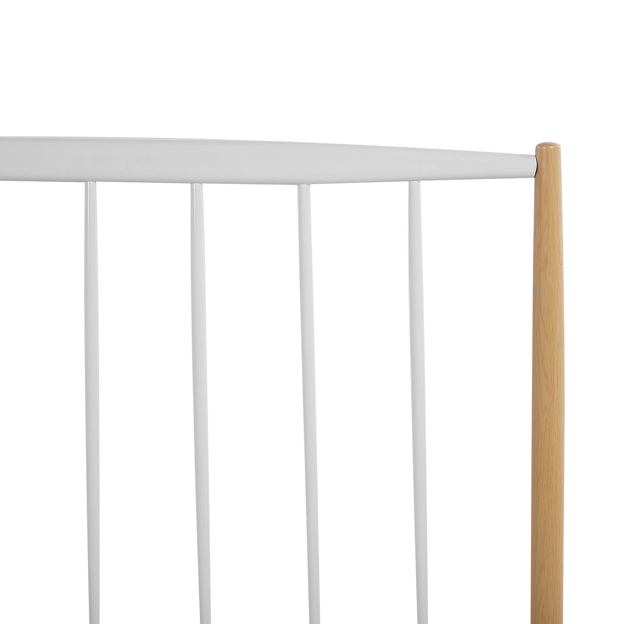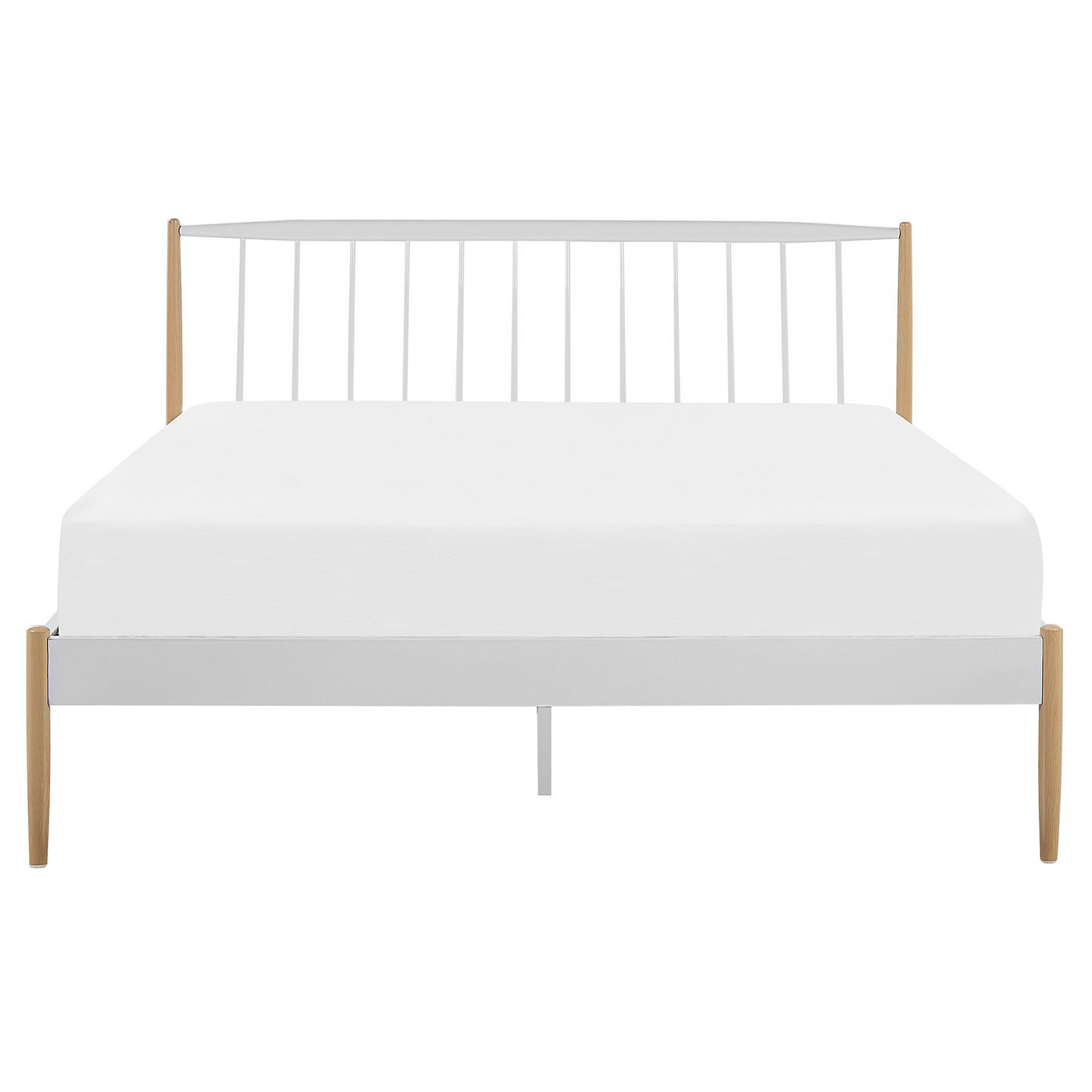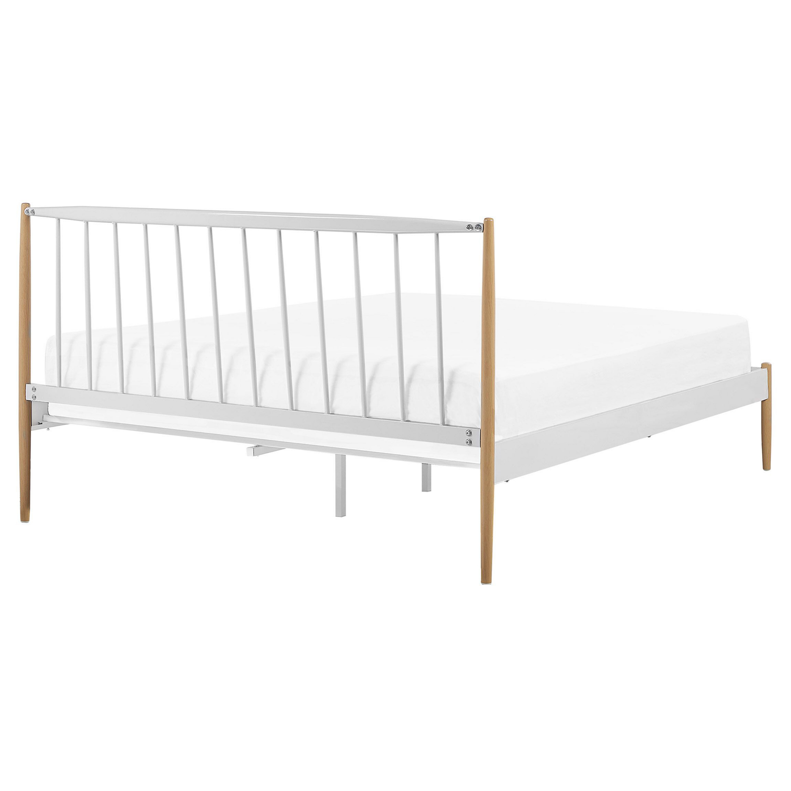 Lit double métallique blanc et marron avec sommier à lattes 160 x 200 cm inclus. Avec la combinaison dune structure en métal et de pieds en bois de peuplier, ce lit deux places s'intégrera parfaitement aux chambres dinspiration scandinave et rétro. La tête de lit haute offre un bon maintien lors de la lecture d'un livre ou du visionnage d'un film et empêche le mur de se salir. Le lit aura une apparence parfaite avec une combinaison doreillers et des couvertures cosys de différentes couleurs et motifs.