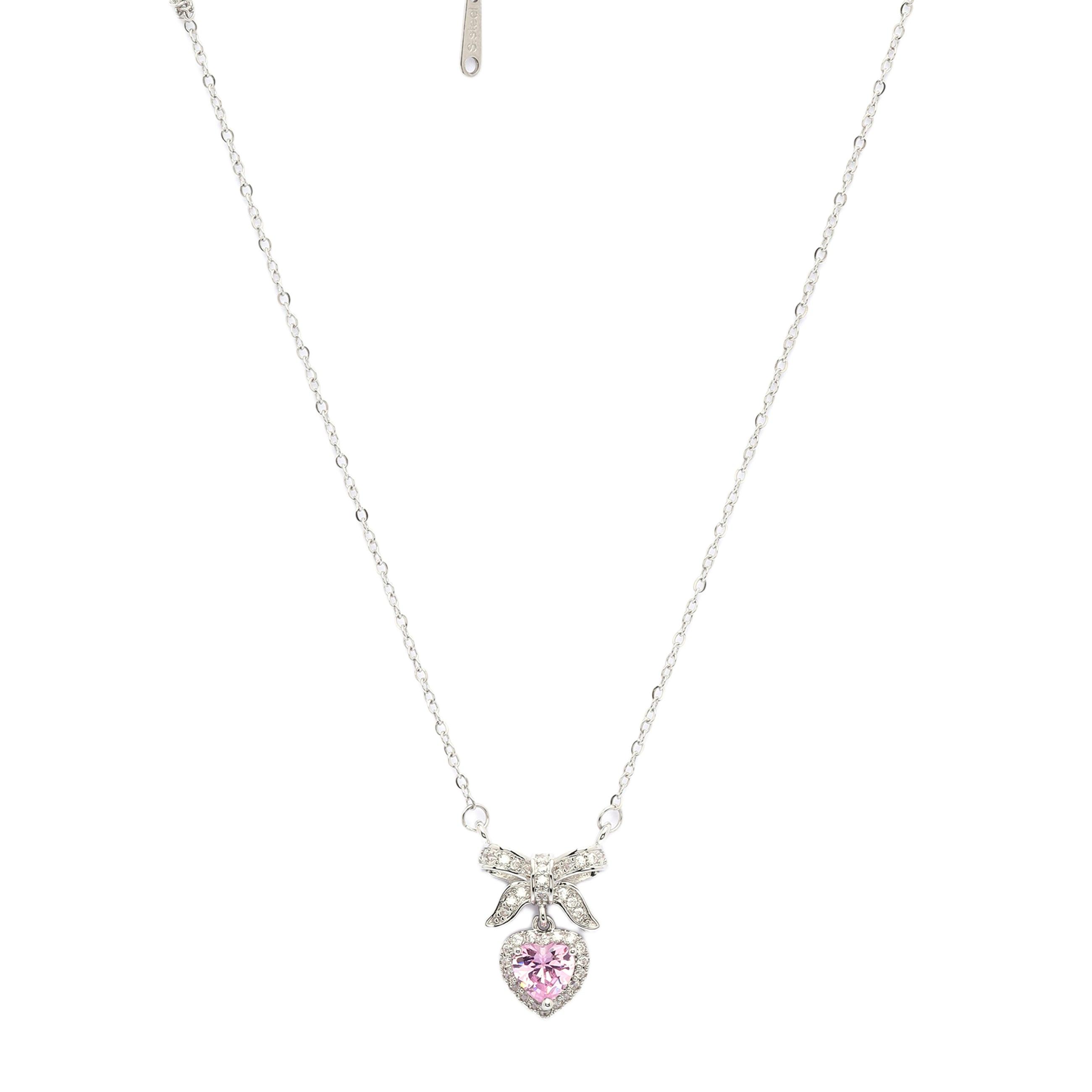 Sublimez votre style avec ce ravissant collier. Orné d'un délicat nœud serti de pierres scintillantes, il met en valeur une magnifique gemme rose en forme de cœur, symbole d'élégance. Sa fine chaîne en argent souligne la grâce de son design, le rendant parfait au quotidien comme pour les grandes occasions. Ce collier est l'alliance parfaite de la douceur et du style, une pièce précieuse qui deviendra sans aucun doute un incontournable de votre collection. Dimensions : 1,5 cm x 2,0 cm | Placage : Rhodium | Fermoir : Mousqueton