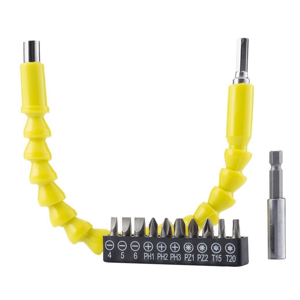 Une rallonge flexible pour perceuse ou visseuse, avec rotation à 360º qui permet de visser ou dévisser des vis dans des espaces difficiles d'accès. L'extension est également magnétique pour une prise sûre et stable. Il peut être utilisé pour les outils électriques et manuels. Un porte-embout et 10 embouts (3 embouts plats type 4-5-6, 3 embouts type PH1-PH2-PH3, 2 embouts type PZ1-PZ2 et 2 embouts type T15-T20) sont inclus.