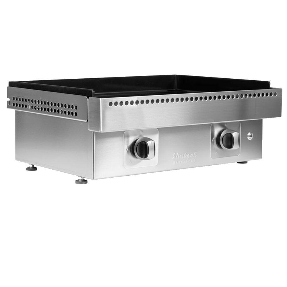 LA PLANCHA RAFFINÉE POUR UNE CUISINE TRADITIONNELLE. Plancha gaz acier laminé : plaque de cuisson amovible en acier laminé au carbone de 6 mm dépaisseur. Dimensions 60 x 40 cm. Rebords de 5 cm. Châssis en inox 304. Pieds réglables pour positionner la plancha. 2 brûleurs en H, soit 4 lignes de feu répartis équitablement sur la surface de cuisson, situés à 20 mm de la plaque : consommation éco-responsable, pas de déperdition de chaleur. Montée en température puissante. Allumage : bouton piezzo électronique (pile fournie). Grille daération (protège la flamme du vent). Sécurité : le thermocouple de sécurité coupe le gaz si la flamme séteint (pas de fuite de gaz possible). Bac ramasse-graisse amovible frontal (prévu pour enlever les résidus de cuisson facilement).Capacité : 700 ml. Fonctionne au gaz propane. Arrivée de gaz située à larrière. Nettoyage facile par déglaçage à leau ou glaçons. Lacier est un excellent conducteur de chaleur offrant une parfaite saisie et adapté à tous les aliments : viande, grillades, poissons, légumes, fruits, cuisine à létouffée, etc. IMPORTANT : Une plaque en acier doit être huilée régulièrement. Livré avec tuyau et détendeur pour bouteille propane aux normes Suisses.