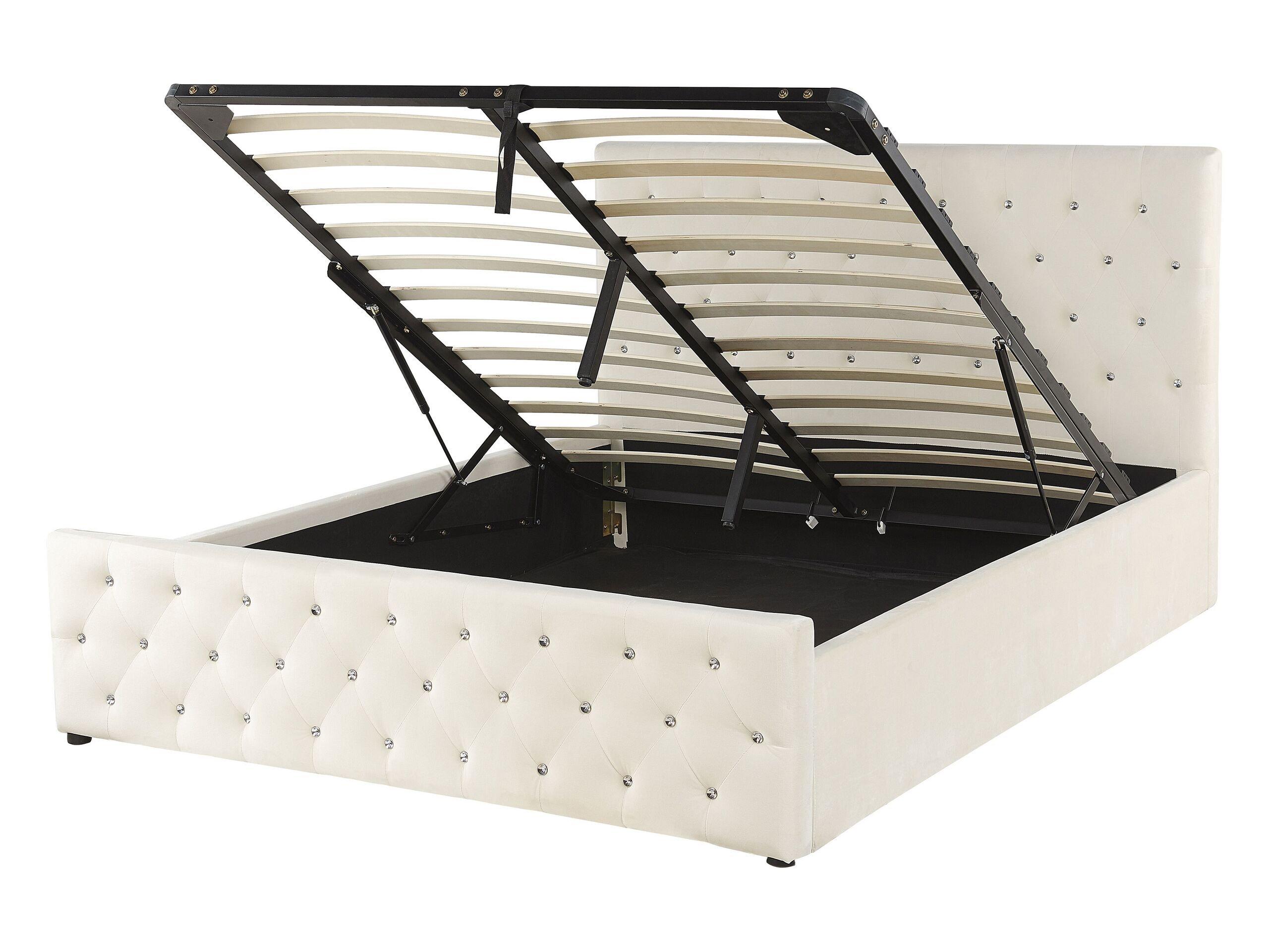 Lit avec rangement sous le sommier. Un lit parfait est essentiel pour une bonne nuit de repos. Celui-ci offre non seulement le confort, mais aussi un look élégant et haut de gamme. Son cadre métallique est recouvert d'une housse en tissu velours doux et soyeux de couleur neutre. La pièce comprend une tête et un pied de lit, décorés d'une touffe subtile et de faux cristaux rayonnants pour une touche glamour. Le lit est livré avec un ottoman de rangement qui pourra facilement accueillir tous vos draps et accessoires de chambre.