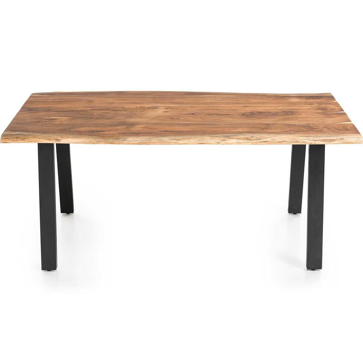 Les meubles en bois massif d'acacia font partie des meubles à la beauté intemporelle qui ne se démodent jamais. Le plateau de table de 35 mm d'épaisseur aux formes naturelles est en acacia. Il a été huilé et ciré deux fois, ce qui rend la surface insensible et résistante à l'humidité. Le piètement stable en métal revêtu par poudre en noir mat confère à la table une très bonne stabilité et est le pendant du beau plateau de couleur naturelle. Cette table de salle à manger est bien plus qu'un simple siège pour manger. Faites entrer un peu de nature chez vous. Remarque:Comme cette table en bois massif est un produit naturel, il peut y avoir des trous de noeuds ou des décorations de couleurs différentes, qui ne sont pas des défauts mais qui soulignent le caractère individuel du bois véritable. La profondeur peut également varier en raison de la forme naturelle. Toutes ces différences font de cette table de salle à manger une véritable pièce unique.Table de salle à manger avec structure métallique moderne, fabriquée en bois d'acacia massif.La surface doublement cirée rend le bois particulièrement résistant.Les bords aux formes naturelles confèrent au plateau un charme naturelPlateau de 3,5 cm d'épaisseurConstruction stable grâce à des tubes métalliques massifs de 80x40 mm